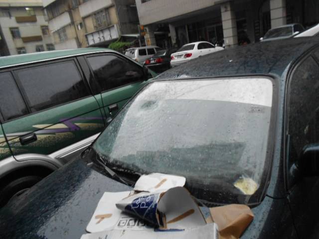 鼓山警分局龍華所31日中午12時許接獲報案,指轄區華寧路大樓遭雷擊,樓下車輛並被落石擊中,到場發現有4部自小客車受損,傷及左後鈑金、車燈、擋風玻璃,甚至砸凹車頂,所幸沒有波及行人,不過住戶已被嚇壞。