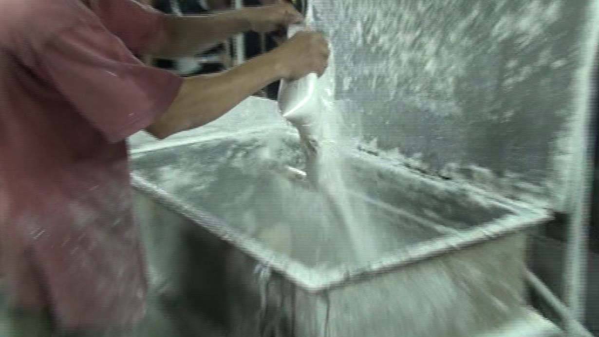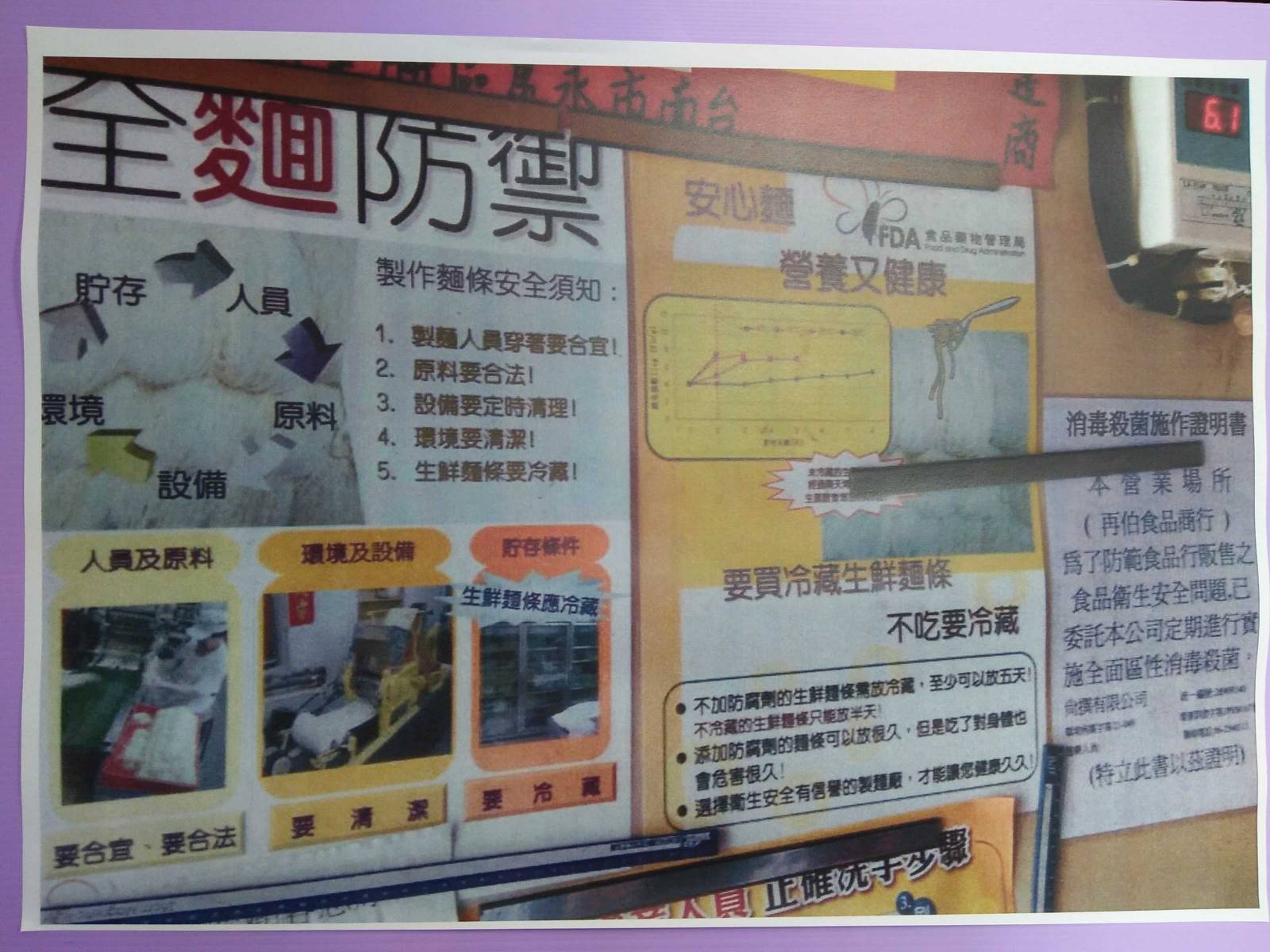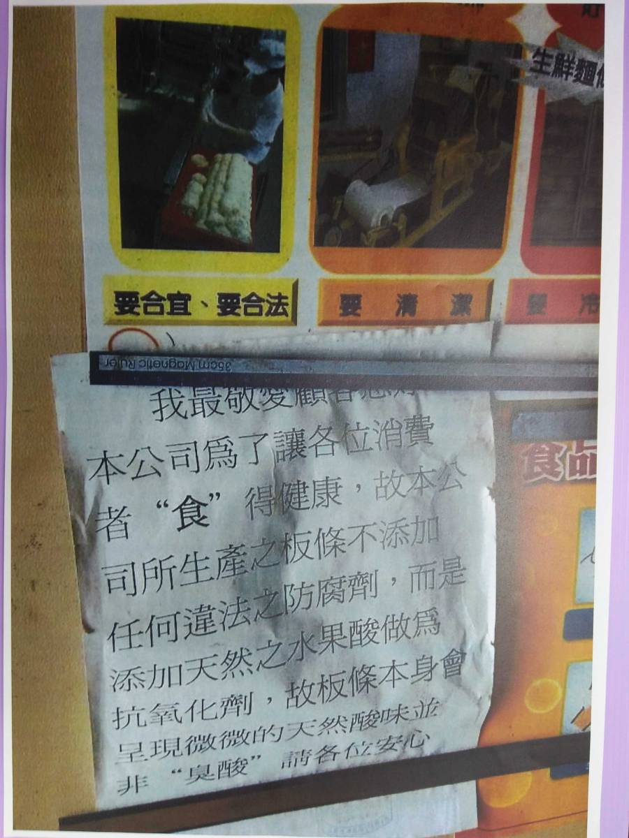 稽查人員現場蒐證時,發現大量農產的工人在做麵時還會加入1包不明白色粉末,究竟是什麼成份沒人知道,已採樣化驗。另有在旁炸油豆腐的工人表示,雖然在大量農產工作,但環境衛生不佳,也不敢把麵拿回家給孩子吃。