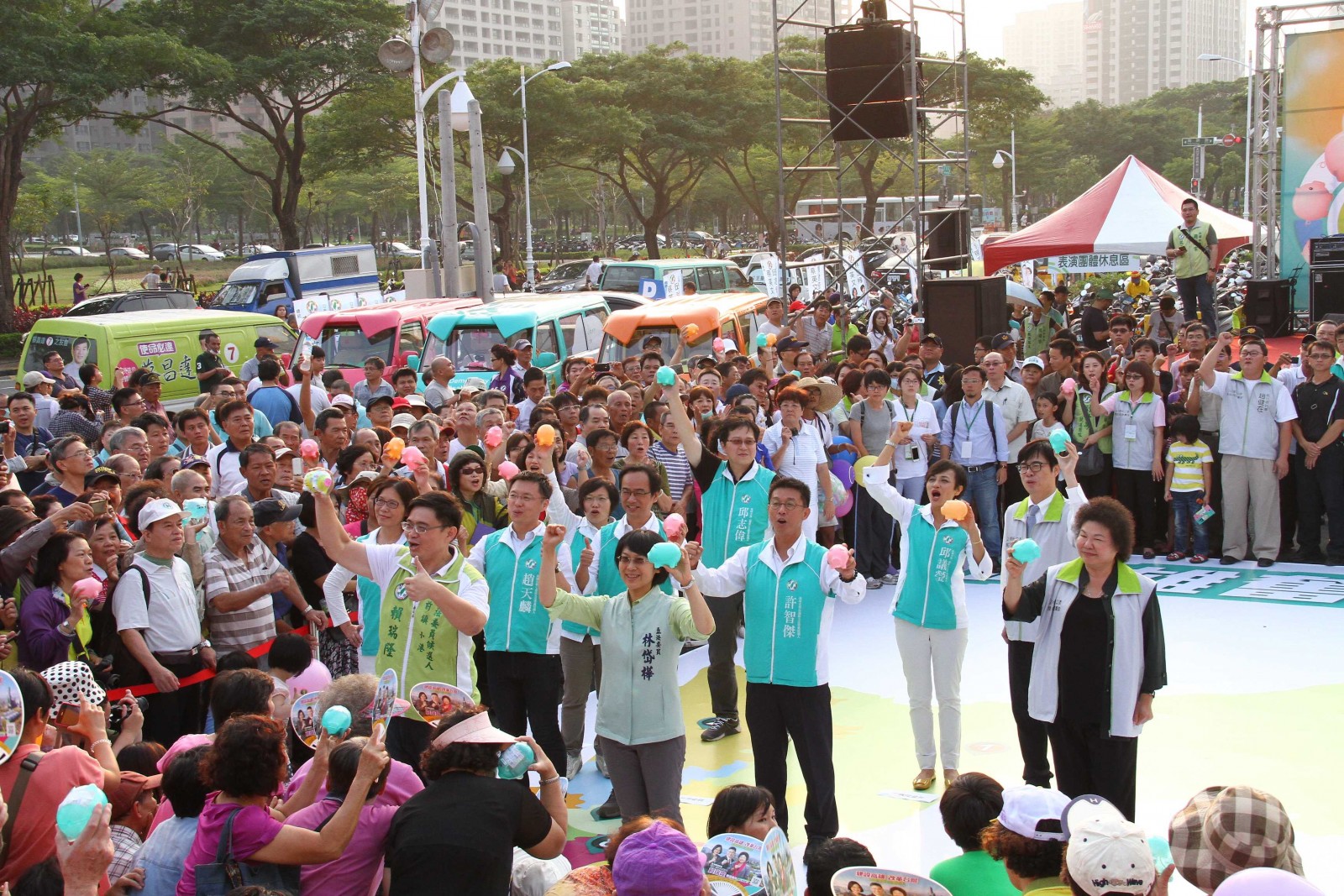 全國競選總部主委陳菊帶領高雄市九席立委參選人劉世芳、李昆澤、黨籍議員與競選總部幹部全員到場,除了營造大團結氣勢,更訴求政黨輪替、高雄九席立委全壘打,改革國會的決心
