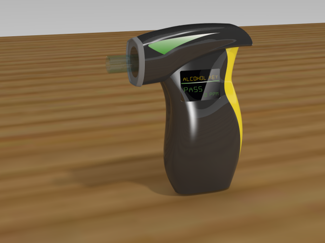 「兼具酒測儀功能之酒精鑰匙」則結合車鑰與酒鑰,實現酒測鑰匙,可減少因酒駕導致憾事的發生。張簡嘉壬指出,無論開車或機車族,當駕駛者駕車前,必須對著酒精鑰匙偵測孔吹氣,以感應酒精濃度,並透過RFID發出控制訊號給車體電控系統,只要通過酒精測試後就能順利發動車輛,確保行車安全。
