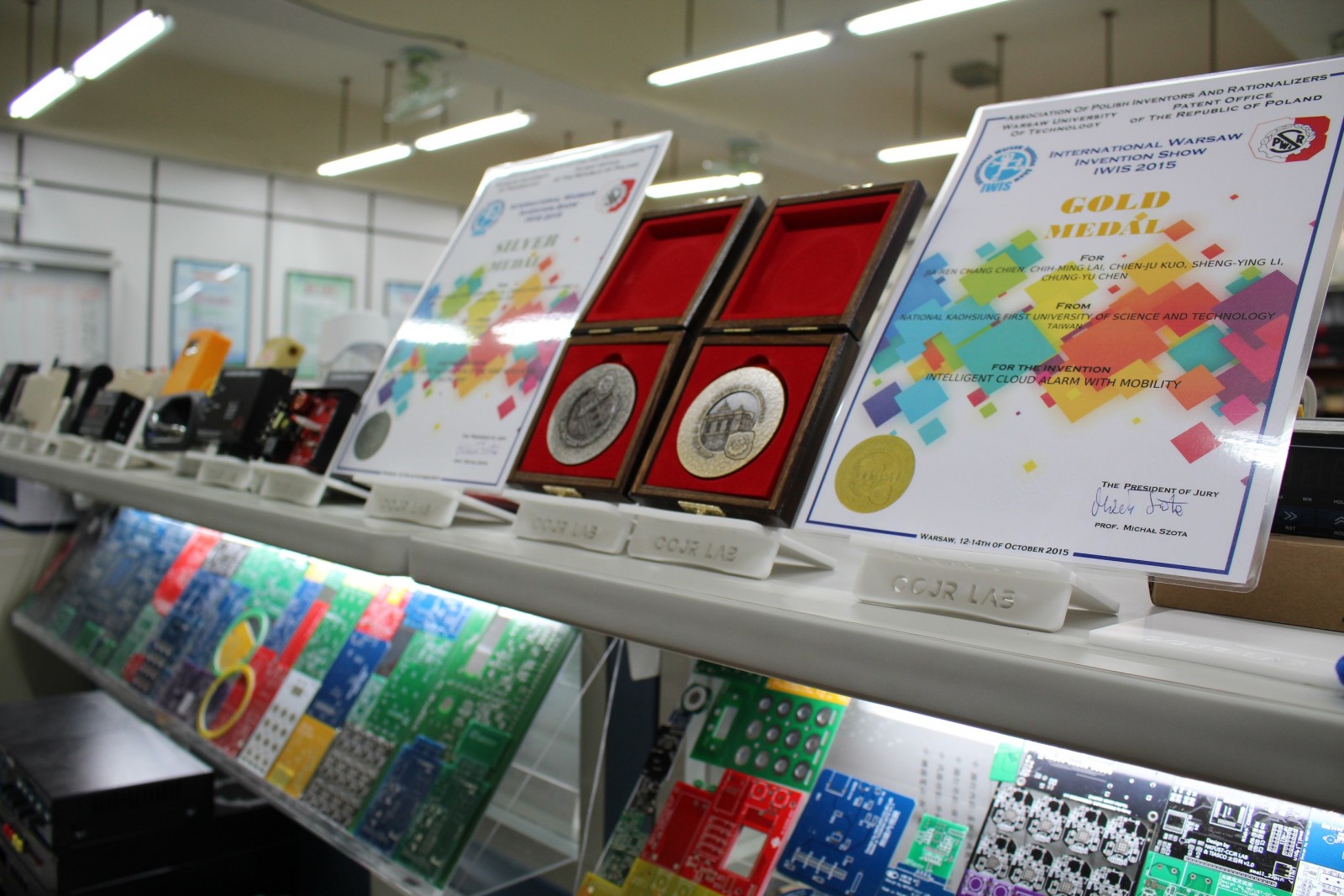 國立高雄第一科技大學研發成果再傳捷報!電子系老師張簡嘉壬帶領學生賴志銘、李盛穎、陳重佑、郭芊汝發明「可移動性之智能雲端化警報器」及「兼具酒測儀功能之酒精鑰匙」,分別榮獲2015年波蘭發明展1金1銀的殊榮。