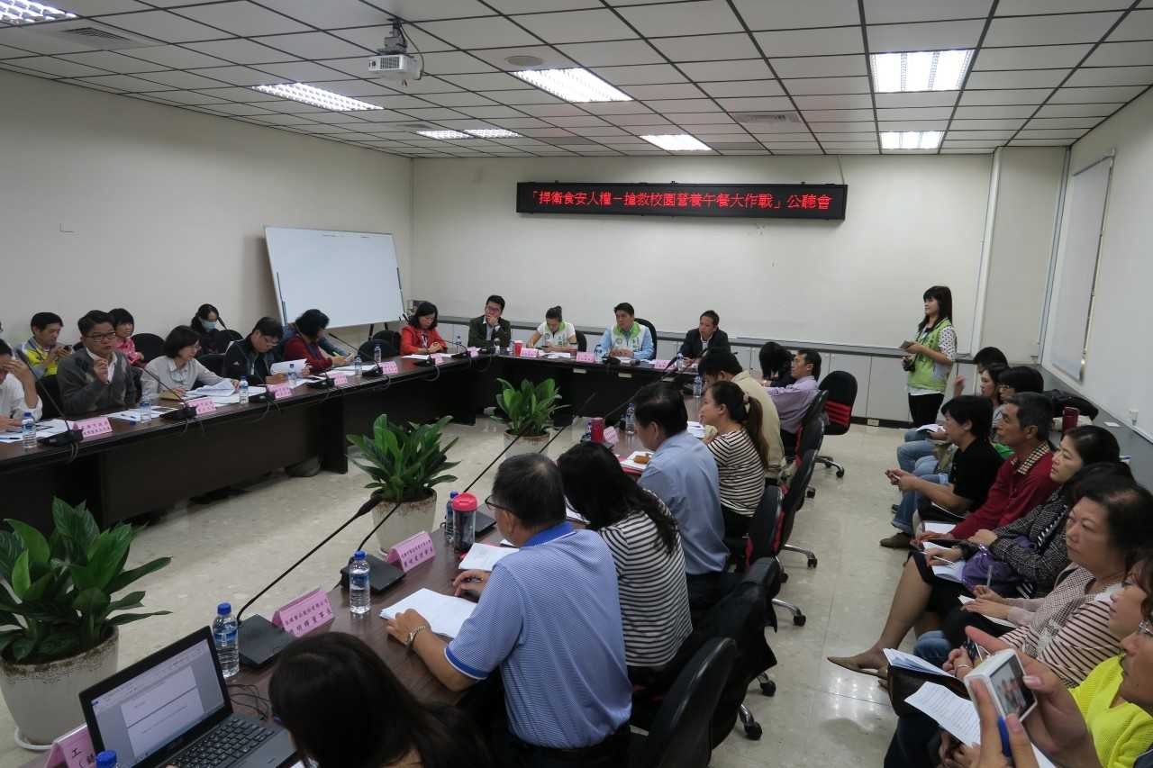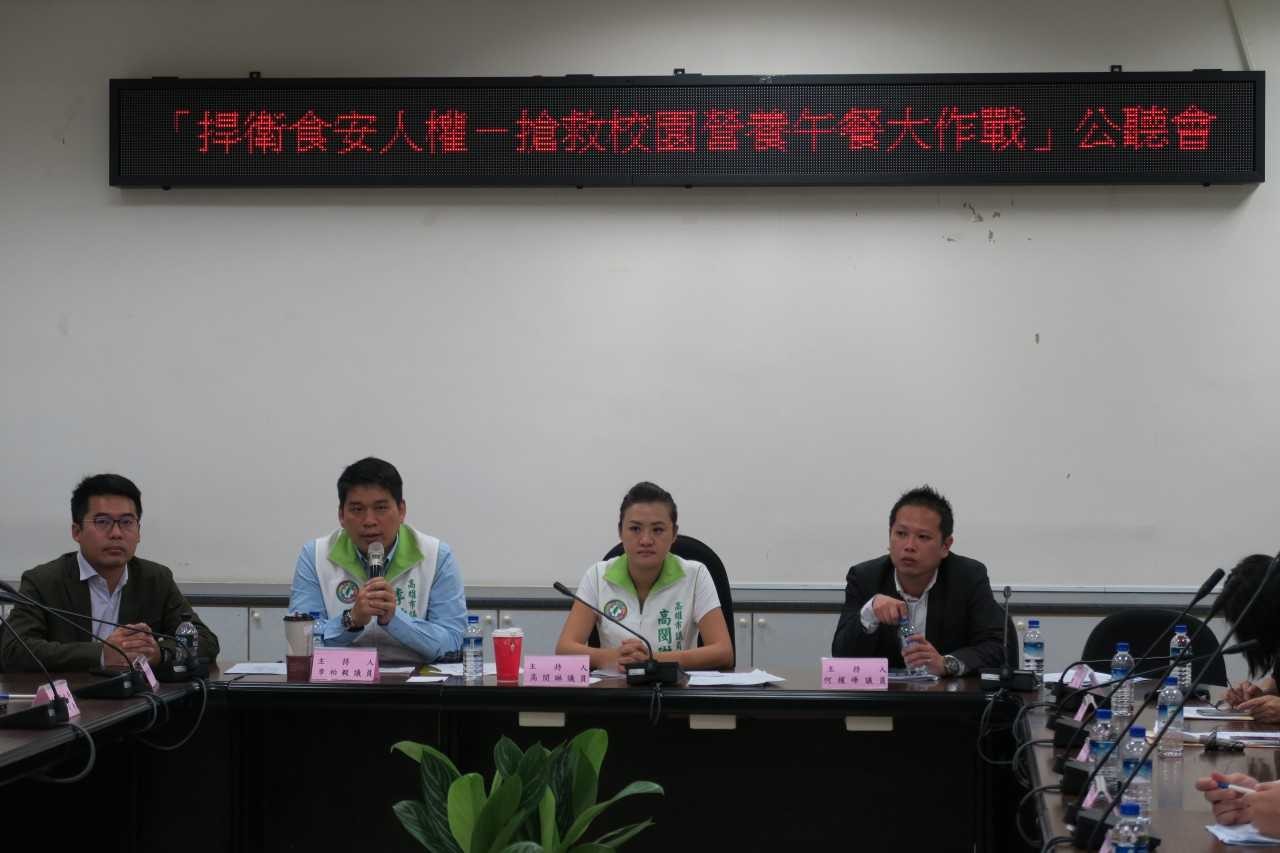 高雄市議員李柏毅、何權峰、高閔琳為因應食安危機,定於今(26)日在高雄市議會召開:「捍衛食安人權-搶救校園營養午餐大作戰」公聽會。邀請到食品業者、醫師學者、學校代表及政府單位共同探討校園營養午餐品質問題。針對價格與食材品質問題,全面贊成漲價。教育局表示: 以提升午餐品質為主,會參考物價指數改善營養午餐價格,調價上教育局目前有價格上的規範,至於營養師部分常遇人力問題,會考慮用社區型的模式來協助學校,讓人力充分妥善運用。