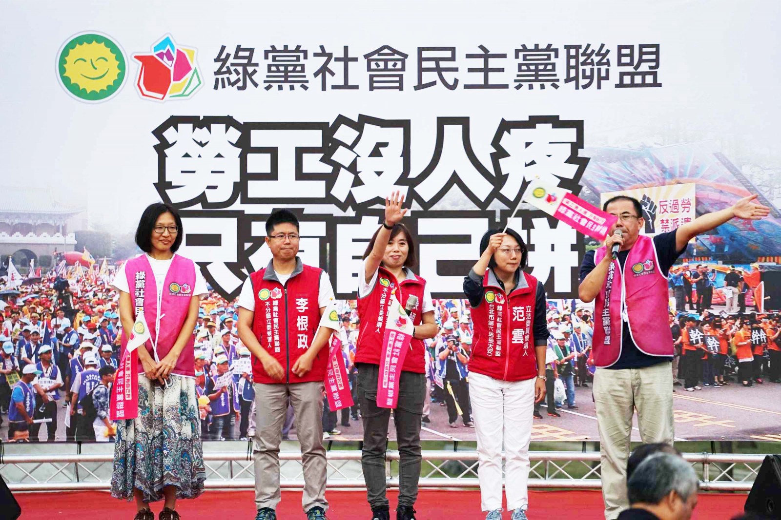 由於各大政黨始終未見提出的勞工政策,對於攸關勞工的長照政策、年金政策態度都含糊不明,令勞工大眾十分不滿。多位勞工代表指出,日前只有綠黨社會民主黨聯盟站出來,反對危害工農大眾生計甚巨的兩岸貨貿協定。綠黨社會民主黨聯盟共同召集人范雲表達出勞工的憂心:「我們民主政治被財團偷走,我們的民主化對勞工不公平,我們好不容易有台灣的民主,卻沒有勞工的政黨。從服貿到貨貿,我們現在面對的,是更可怕的是跨海峽財團,面對這些威脅,勞工更應該團結起來。」