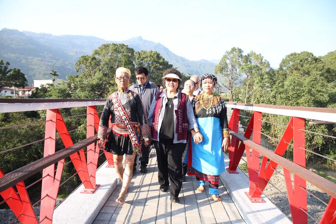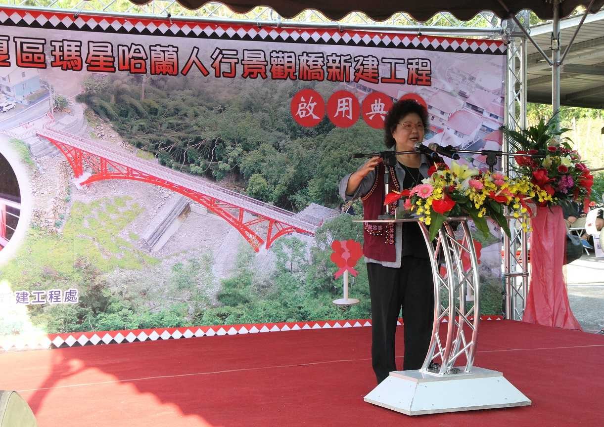 那瑪夏區達卡努瓦里瑪星哈蘭人行景觀橋11/28下午舉行啟用典禮,高雄市長陳菊親臨剪綵,她表示,重建是條漫長辛苦之路,時隔六年,今日再次回到那瑪夏區,尚有部分道路仍須修復,為了讓那瑪夏區每位孩子上下學更安全,市府規劃設計瑪星哈蘭人行橋,把象徵原住民元素的圖騰納入工程設計考量,兼顧安全及美觀,盼提升原鄉地區用路安全。
