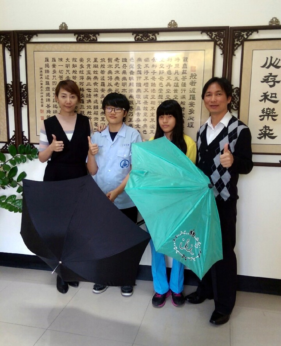 2年級的高子捷、張恬嘉同學的「可拆傘」,今年也榮獲「105年高雄市Maker創意作品類國中組第2名」,發想來自2人於放學時,雨季時常遇上滂沱大雨,但許多同學都會忘了帶傘,結果與同學共撐1把傘享受雨中浪漫,卻因此被淋成落湯雞。