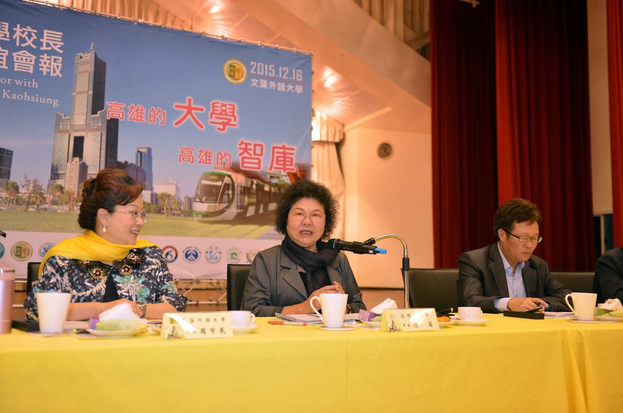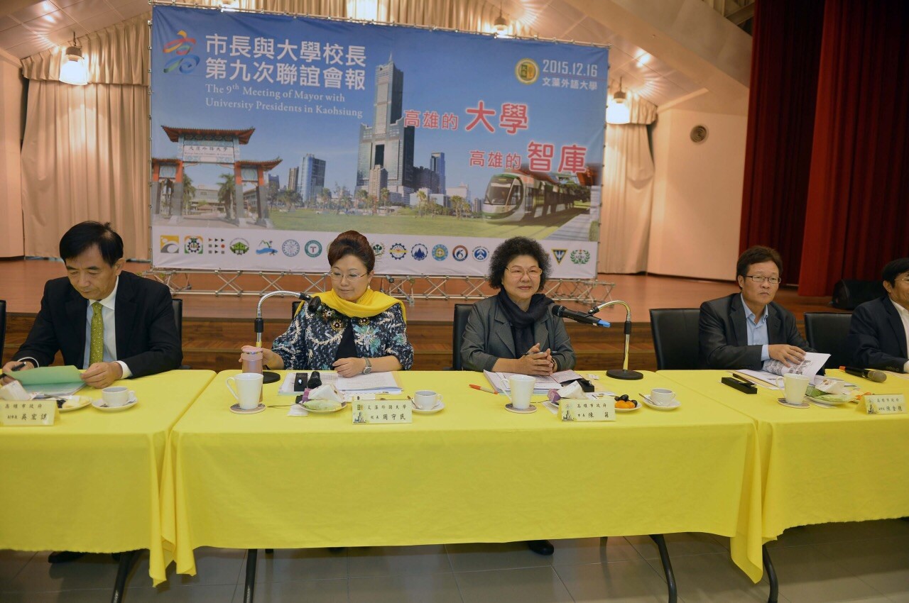 高雄市長陳菊與大學校長第9次會議今(16)日下午於文藻外語大學舉行,會中熱烈討論電子商務及智慧城市,希望藉由市府與高雄地區大學合作,帶動產業轉型發展,加速城市的升級。