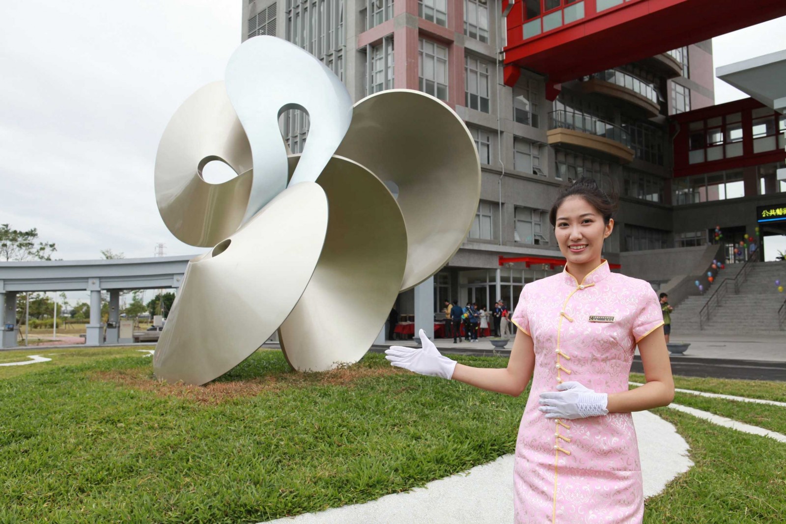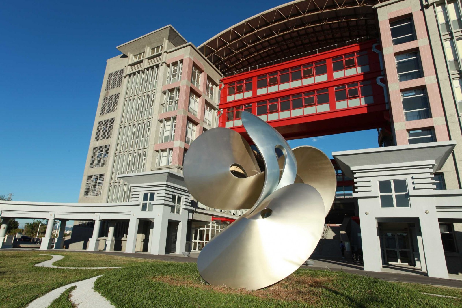 國立高雄大學日前舉行「睥睨寰宇、經綸圓融」啟用儀式,成為校園第9座大型公共藝術。外觀除了以「圓」與「弧」幾何圖形勾勒作品主體,更吸睛的是其金屬表面,交錯散發時下流行的香檳金、白銀光澤,相當大器討喜,尤其經日照反射更加耀眼,暱稱是「金包銀」,已成新興拍照景點,安裝過程縮時攝影可見:https://youtu.be/wBsM7AuG9fA。