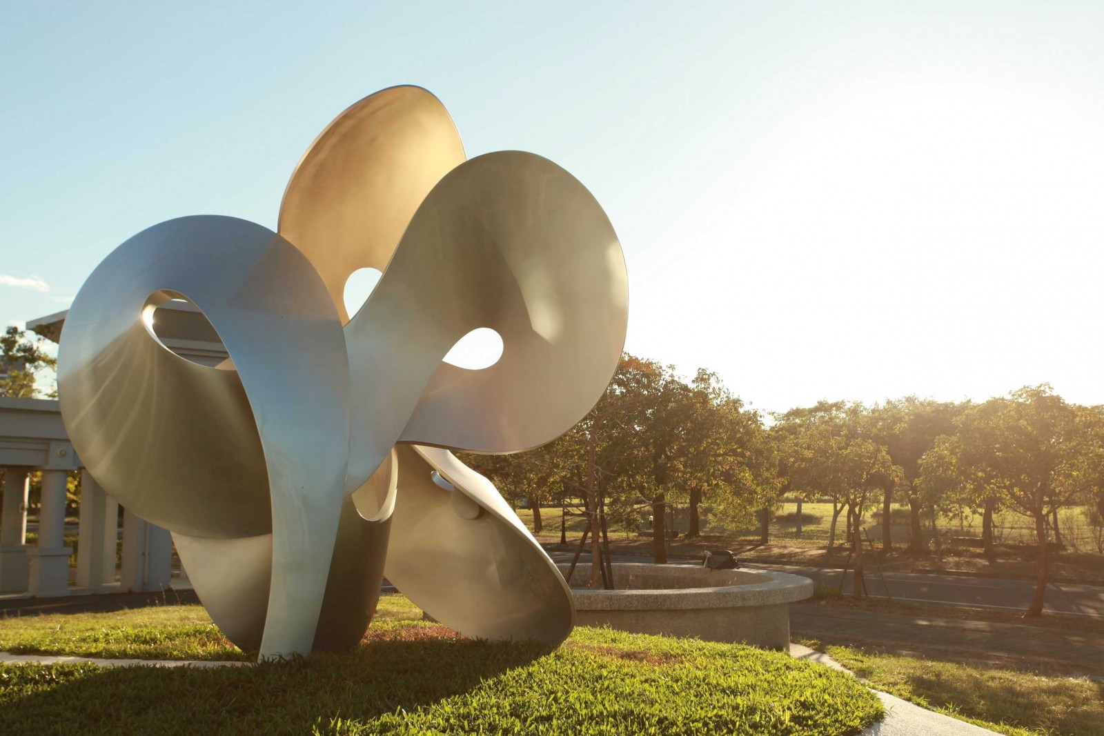 地點刻意挑選東西座向,不同時間產生光影變化使作品視角更多層次,恰如「橫看成嶺側成峰」。簡明輝推薦下午是絕佳欣賞時刻,特別當陽光灑落於作品時,「金包銀」效果愈加明顯。此外周圍還鋪設草坪並繞以蜿蜒白色小徑,營造探索趣味。有別於多數公共藝術僅可遠觀,簡強調挑選耐踩踏的「綠地毯」作為草坪,鼓勵大家多親近觀賞、拍照都可以。