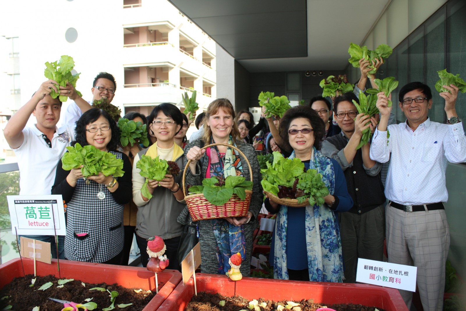 教育局推動「食農教育」,由范巽綠局長號召各科室人員,以「簡單種、趁鮮採」方式,於上月(11月)27日在教育局辦公室露台栽種萵苣、茼蒿、白菜等作物;同仁們利用休息與下班時間,用心翻土、插苗、澆水,藉由綠色蔬菜妝點辦公室露台,讓露台綠意盎然,一起打造辦公環境可食綠景。