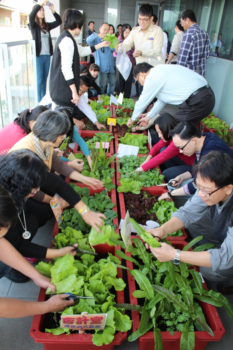 高雄市政府教育局從今年11月開始,結合可食作物栽種,藉由在辦公室露台栽種蔬菜,綠美化辦公環境,綠色植株一掃灰牆帶來的冰冷印象,教育局長范巽綠於今天(18日)帶領各科室主管歡喜收成,表示推動「食農教育」就從教育局開始,讓都市也能充滿著「美味」的綠意,。