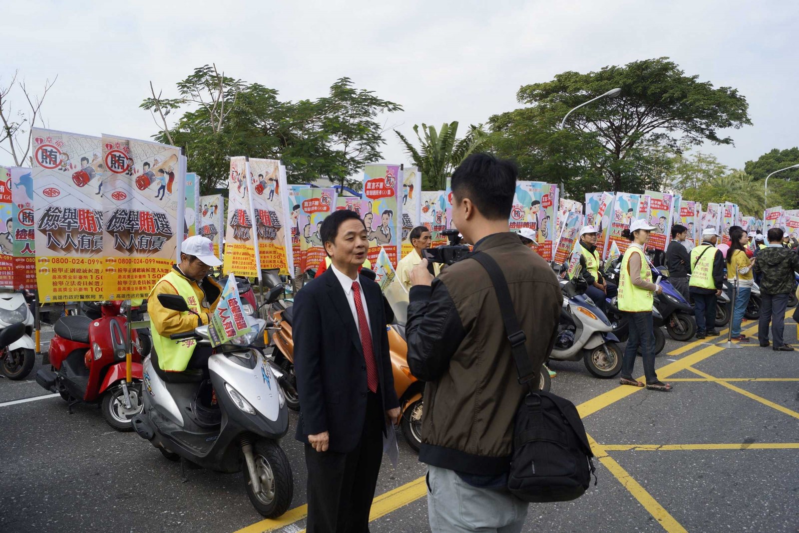 今(104/12/29)日上午10時於雄檢河東路廣場舉行誓師大會,檢察長周章欽、選委會楊主委、市警局阮副局長、政風處陳處長及民政局林副局長等人出席與會。除安排高雄憲兵隊演唱反賄版「英雄好漢在一班」,也邀請羽球國手戴資穎、中職四隊啦啦隊長、義大吉祥物(大義)一起合打反賄好球,另透過「大刀闊斧、勢如破竹」之儀式,由與會代表們一起手持斧頭,大力劈開寫有破除賄選之竹子,象徵全體市民都能揭竿起義,加入反賄陣線。最後則在現場貴賓與熱情民眾見證下,伴隨著陳市長、周檢察長與警察局陳局長反賄選廣播帶之播放,「反賄小蜜蜂機車大隊」緩緩駛離現場,開始為期18天的反賄之旅!