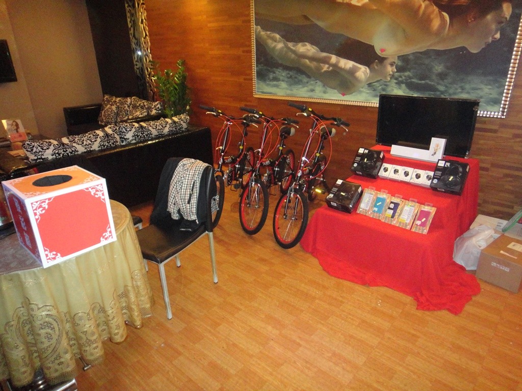 警方發現店內大廳擺滿腳踏車、行車紀錄器等獎品,還有摸彩箱,楊姓負責人透露,是店裡年初就推出的促銷,只要來店消費,就可摸彩1次,最大獎可抽價值逾2萬元的iPhone 6手機,另外還有200元折價券,鼓勵再回來消費。