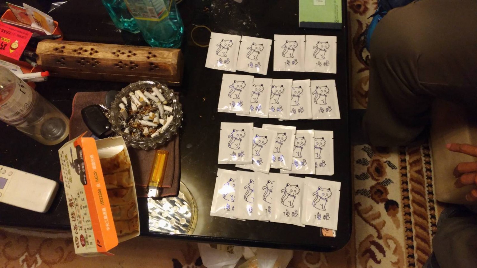 當時陳男朋友買來晚餐找他門沒鎖,警方一推門進入,4男1女正專心看電視,5人一見警察怎麼來了全都傻眼,桌上還有19包毒咖啡包及1包K他命,另有鐵製K盤、電子磅秤及本票,旁邊2隻毛小孩也疑長期跟著吸毒沒活力。