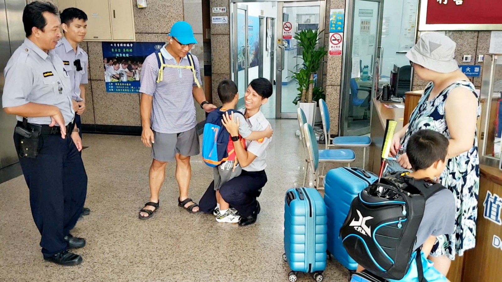孫爸一家重回中山所道謝,因孫童情緒不穩,有6歲女兒的副所長陳威宇感同身受,安撫他「弟弟,下次要注意,沒關係了」,孫媽叫他跟警察叔叔抱抱,陳威宇也大方的給他「惜惜」,自責的孫爸也連聲向警方說謝謝。