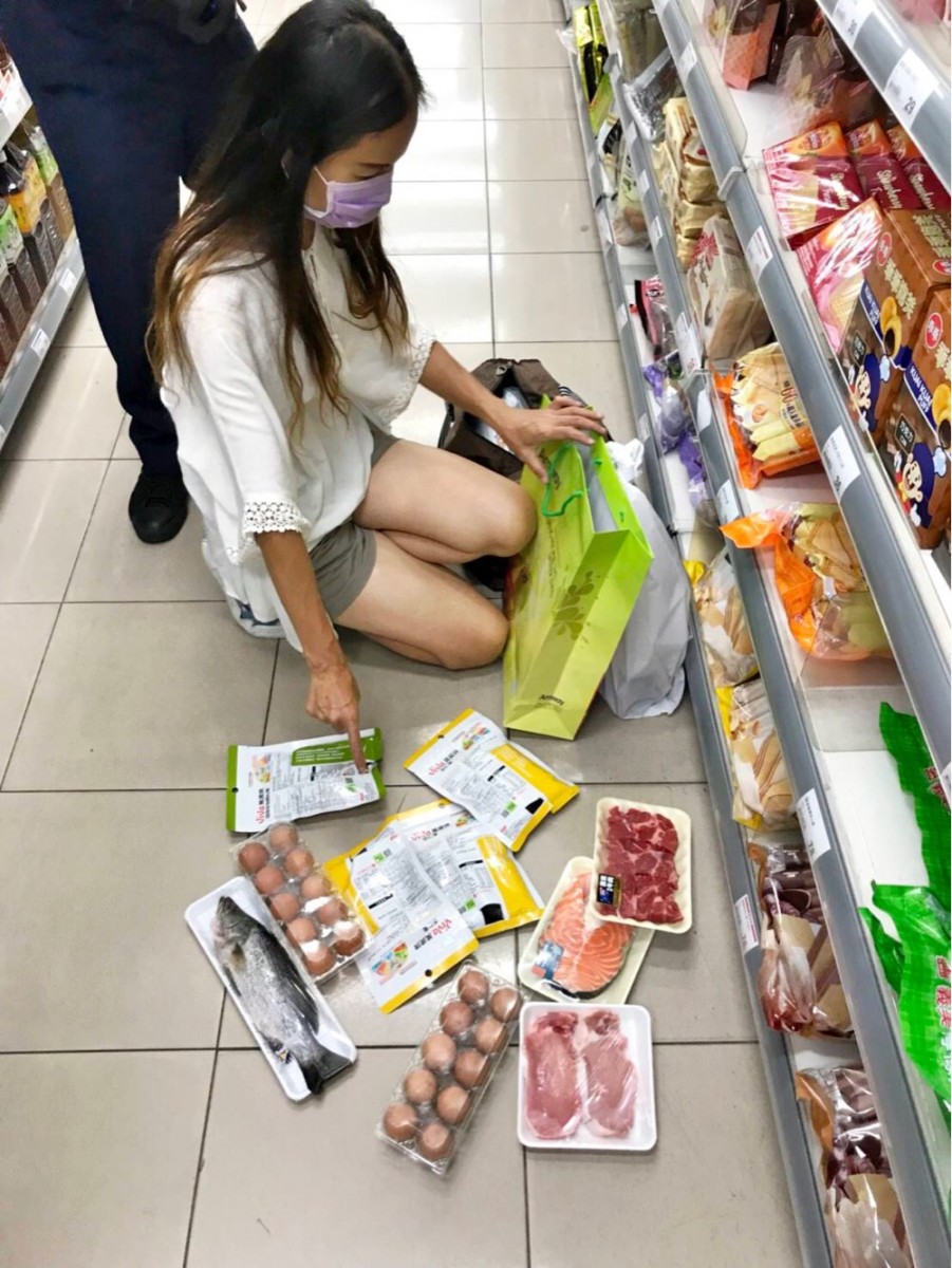 新興警分局中山所調查,52歲陳婦當天進到生鮮超市後,以自備的剪刀,將鮭魚、鱸魚、豬肉、牛肉、杏仁果、開心果、雞蛋等食材外包裝的條碼剪下後放入隨身提袋,並拿了2顆蘋果及濾掛式咖啡,共結帳320元後離去。