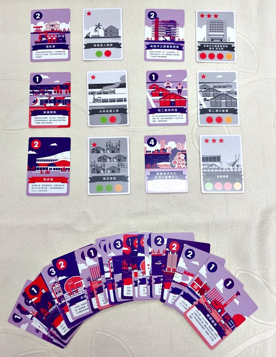 資源卡牌背有6種顏色,用來區分玩家。每組資源卡有5種資源牌面,包括文化觀光卡、港灣再造卡、農漁特產卡、綠色交通卡以及建設卡。建設任務卡有20個景點、共2套40張,灰色印刷代表過去,彩色印刷是完成建設的現在。圓形的資源TOKEN以顏色和圖案分別對應4種資源卡,在版圖上透過資源卡搶拍,換得TOKEN,再用TOKEN去換建設任務卡賺分數。