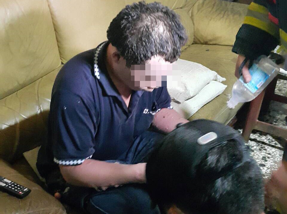 救護人員先安撫陳男,另替他包紮傷口,不過因身上多處被燒燙傷,陳男痛得不斷大聲哀叫,還要求先喝冰飲止痛。準備將他送醫時,他也一度不願配合,出聲反抗、掙扎,最後將人壓制送醫,因四肢灼傷需住院觀察。