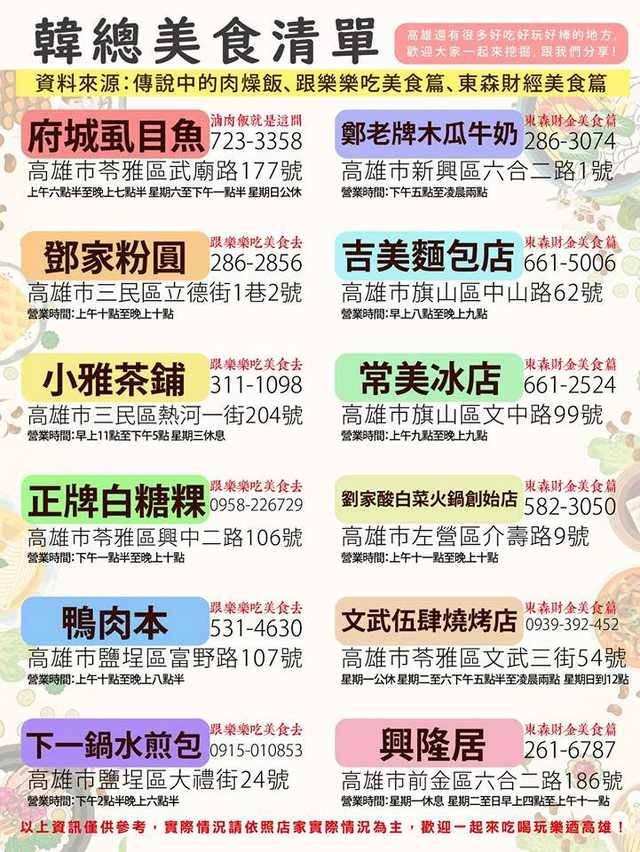 ↓國民黨高雄巿黨部也整理出韓總美食清單,讓民眾可以按圖索驥。