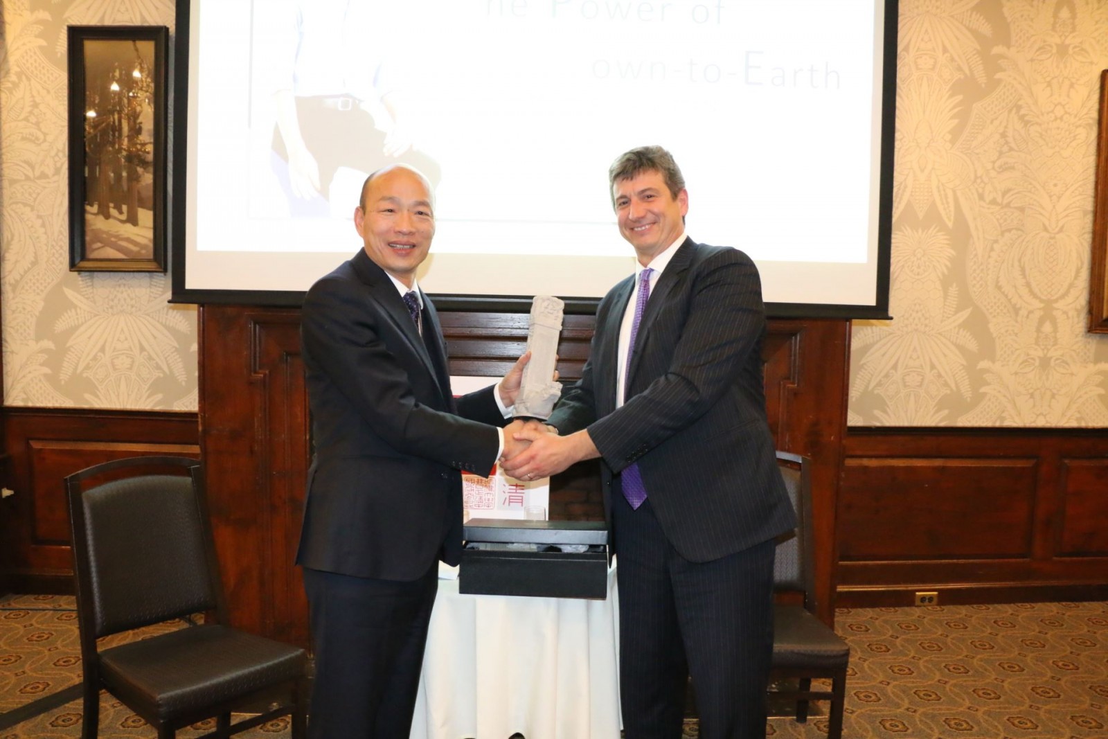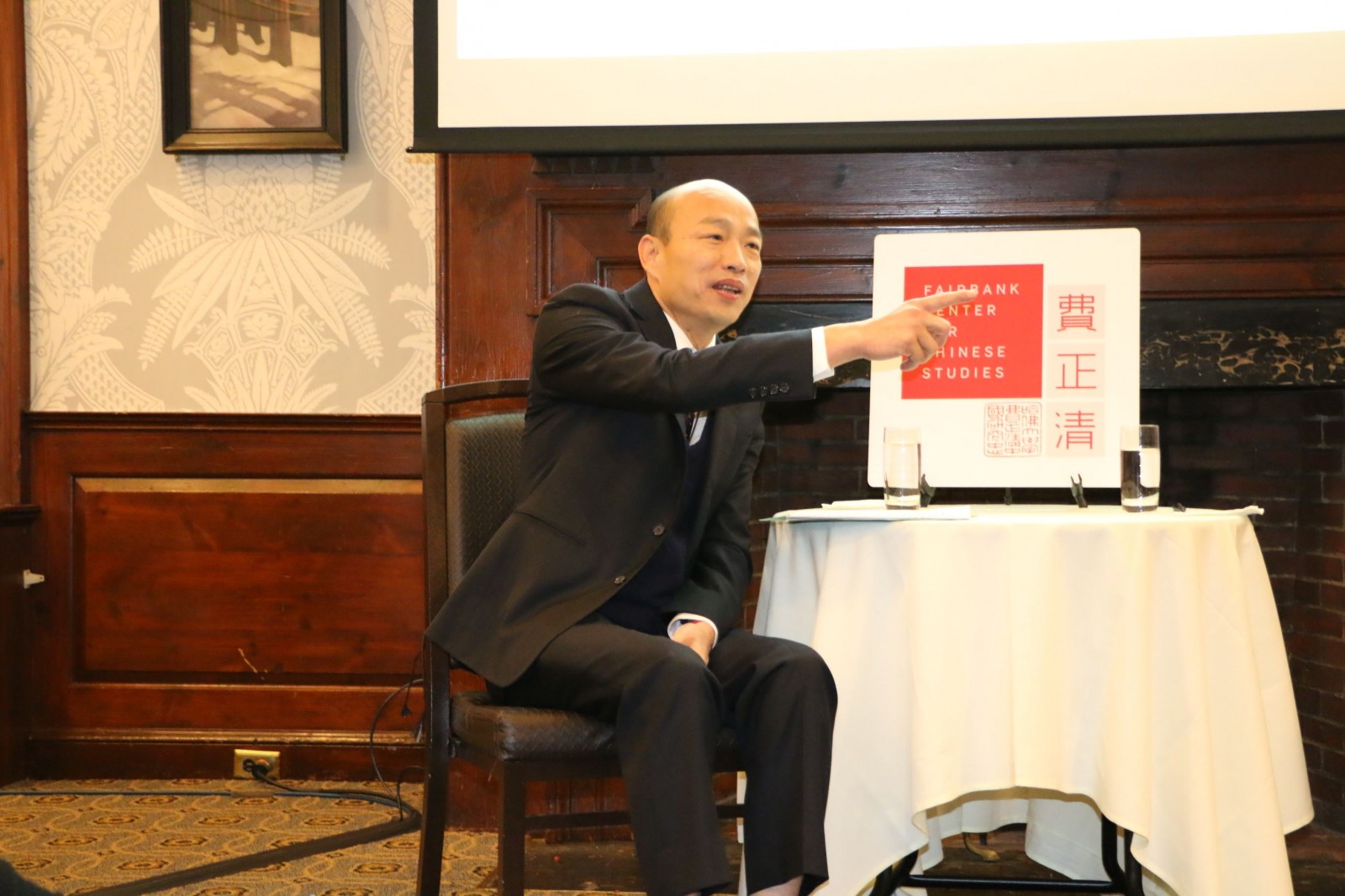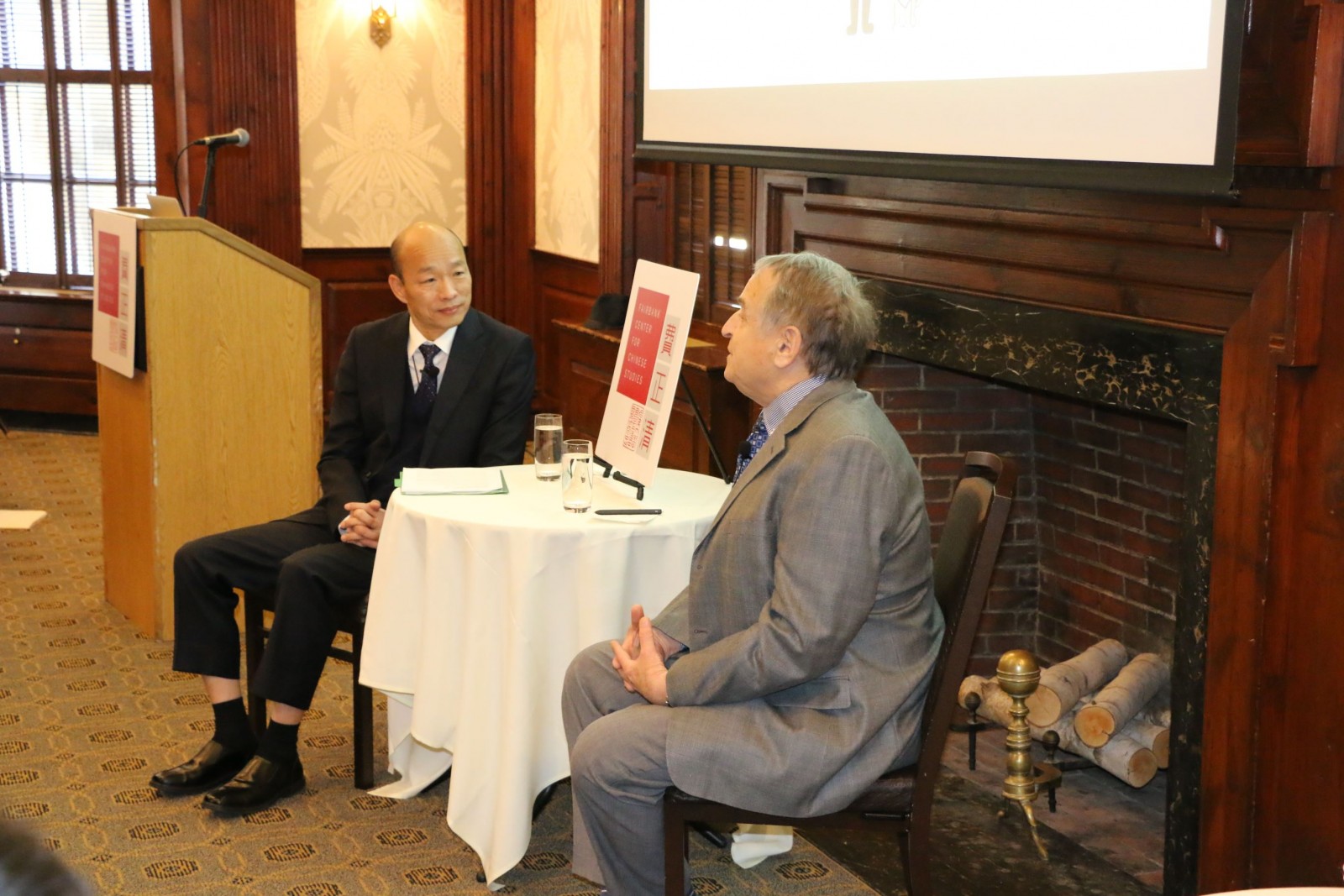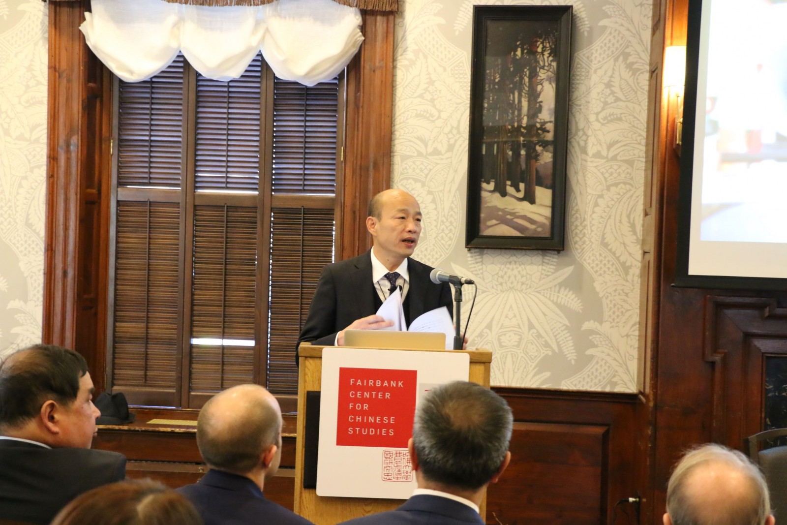 這次韓國瑜受哈佛大學費正清中國研究中心邀請赴美演講,活動著重與國際重要學術單位進行深度交流學習,由費正清中心研究員與哈佛大學台灣研究主任戈迪(Steve Goldstein)教授主持。會後韓國瑜與費正清中國研究中心主任宋怡明(Michael Szonyi)互相致贈禮物。