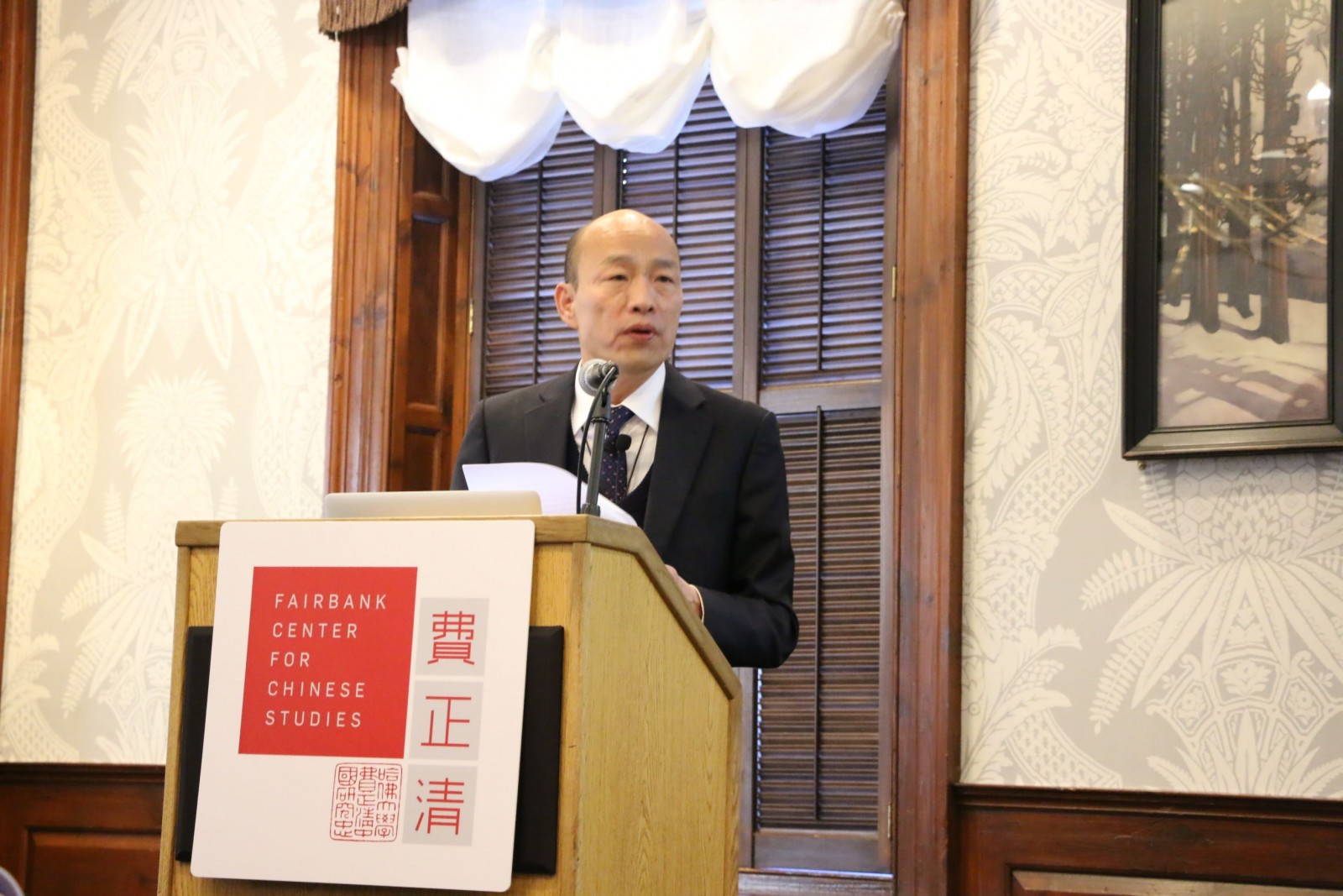 Good afternoon, Director Szonyi, Director Goldstein, ladies and gentlemen, this is my greatest honor and pleasure to be here today and to begin with, I would like to express my appreciation for the long term friendship between the United States and the R. O. C., and for the support from the US government and its people, so we can engage and cooperate closely. I am more than honored to have this amazing opportunity standing at this podium, in front of the distinguished scholars at the Fairbank Center for Chinese Studies, the most esteemed institution of Chinese Studies in the world, to share my story and to talk about what I think and what I want to do as Mayor of Kaohsiung.