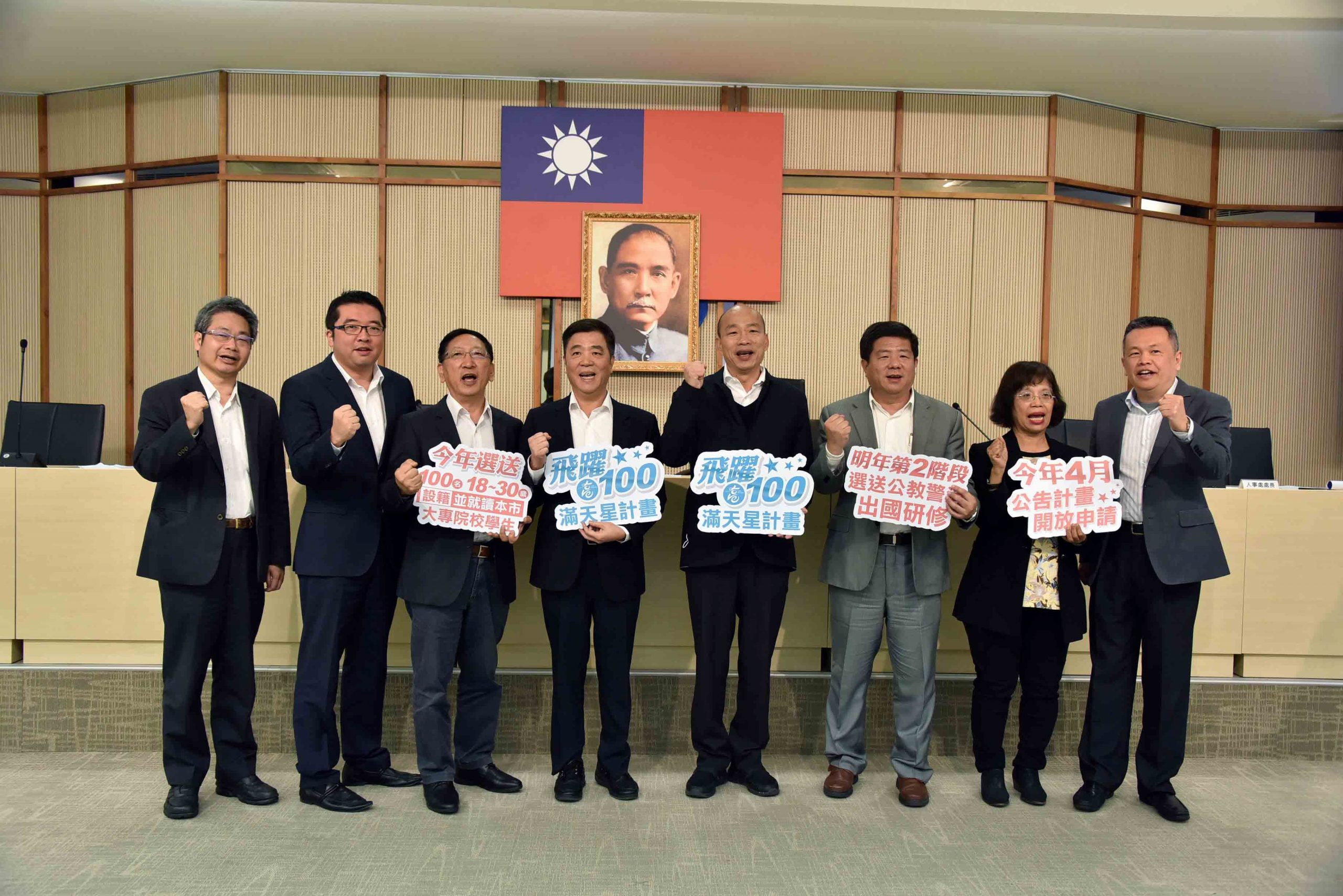 為拓展高雄學子與公務員的國際視野,高雄市政府2/11日由市長韓國瑜對外公布「飛躍一百★滿天星計畫」,計畫分成2階段進行,第1階段遴選百位大專校院學生,補助每人1年2萬美金,提供海外進修學習機會,最快今年9月補助獲選者出國。韓國瑜說,人才培育刻不容緩,他鼓勵優秀學子踴躍申請參加,與國際社會接軌、培養自身語言等能力,成就更多明日之星。