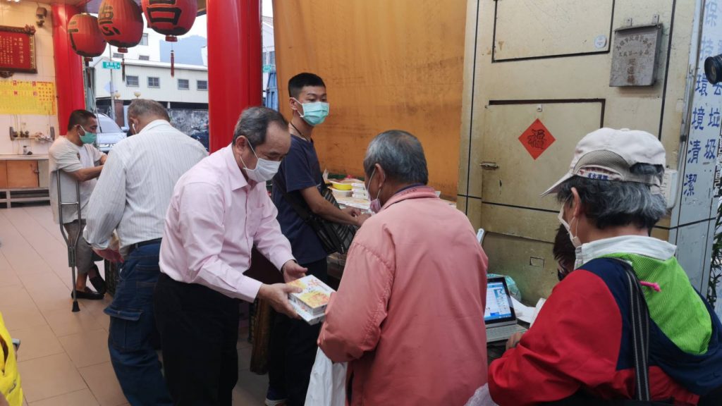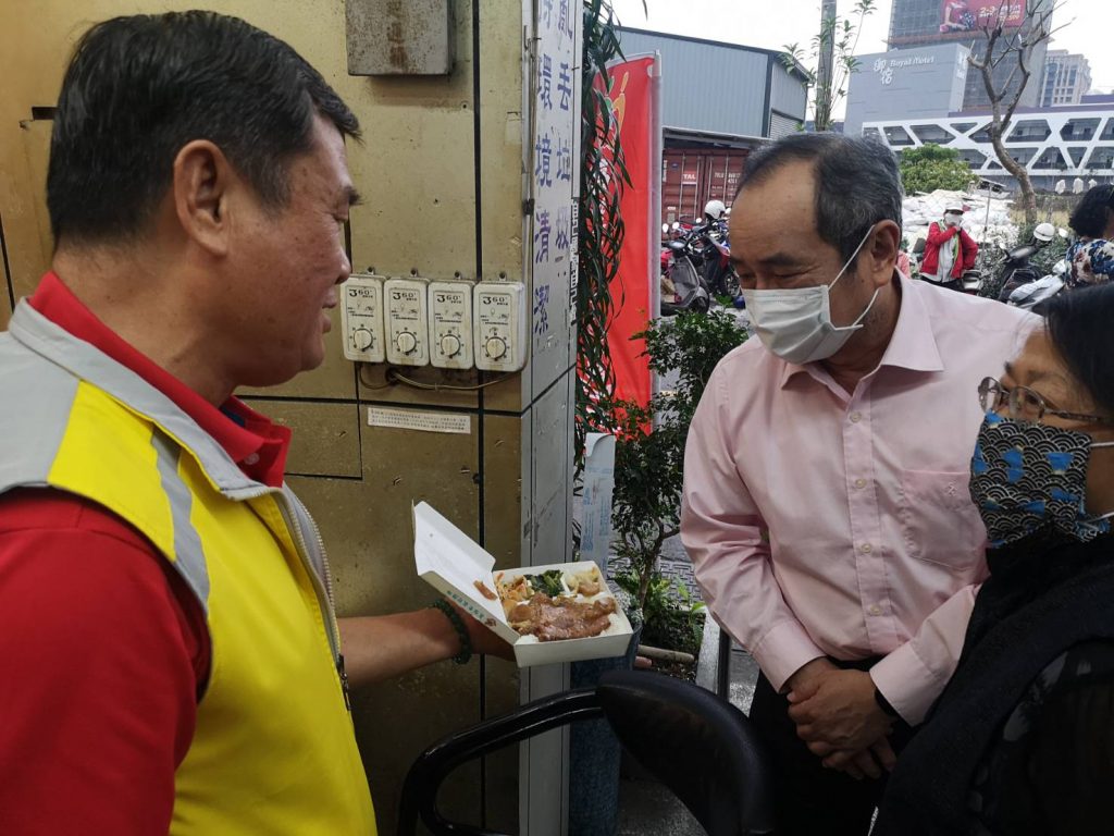 黃淵源特地至街友關懷協會,協助發餐並宣導防疫工作,街友排隊領餐時,服務人員逐一測量體溫,仔細叮嚀注重衛生及口罩正確配戴方法,讓街友們備感溫馨。