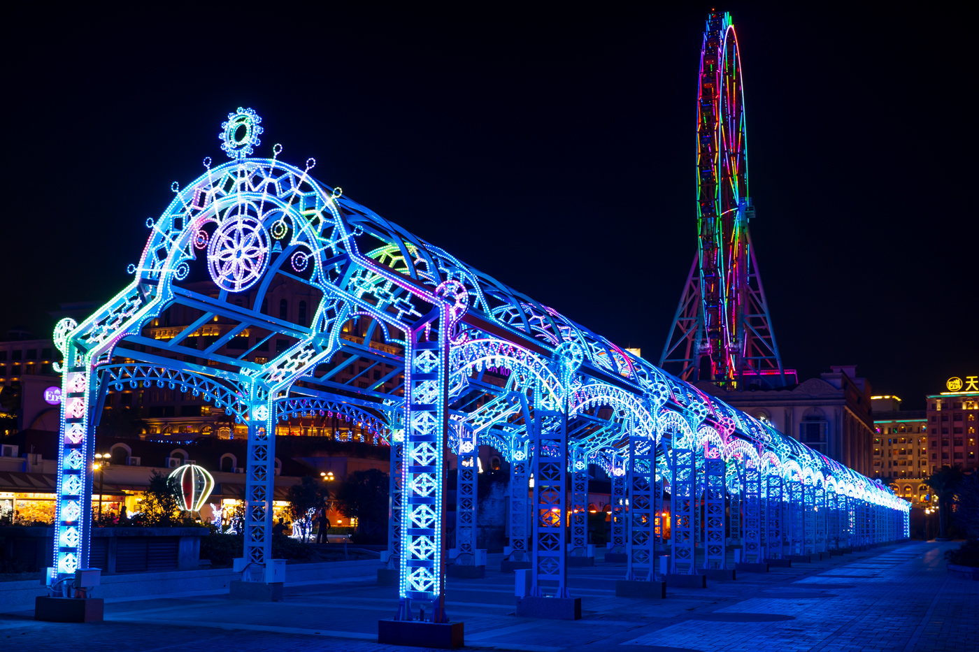 和伴侶手牽手到義大世界購物廣場戶外123露天市集,絕不能錯過的三大網美打卡景點就是「義大世界星悅光廊」,漫步在光彩絢爛的光廊,相當浪漫!全台唯一耗資百萬,以25萬顆LED打造的光廊、大型燈雕「星織光瀑」以及愛心燈雕「點點心義」,為白色情人節留下最閃耀的紀念!