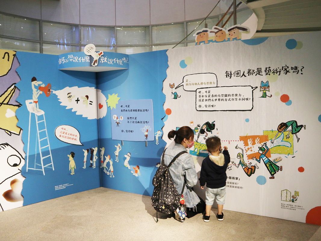 高市圖總管國際繪本中心精心製作只有2頁的巨型書本裝置,以「哲學,可以吃嗎?」為題向眾人提問,展示內容結合法國經典哲學繪本作家奧斯卡‧帕尼菲「哲學‧思考‧遊戲」部分單元,看似平凡問題「每個人都是藝術家嗎?」、「你可以想說什麼就說什麼嗎?」及「你怎麼知道父母愛你呢?」帶人思考個人特質、言論自由及愛的形式,問句的設計引導民眾進行不同層面的想像與討論,並設有「小小藝術家」與「愛的證據」互動小遊戲,館方提供每日限量的畫紙讓讀者現場作畫及粉紅紙條留言,吸引不同年齡層讀者參與創意思考,歡迎還沒到場體驗的大小朋友,在4/19前趕快來留下個人創意想法。