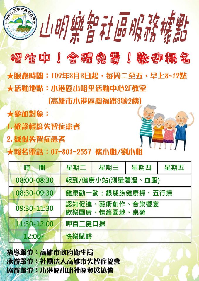 全世界失智症以每3秒1個的速度在成長,國內大約40分鐘也多一個失智病人,全國失智人口已超過28萬人,高雄市患者也將近4萬之多。 高雄市立小港醫院及高雄市失智症協會設置「山明樂智學堂」據點,在山明里活動中心提供失智患者及家屬一個友善、喘息的空間。