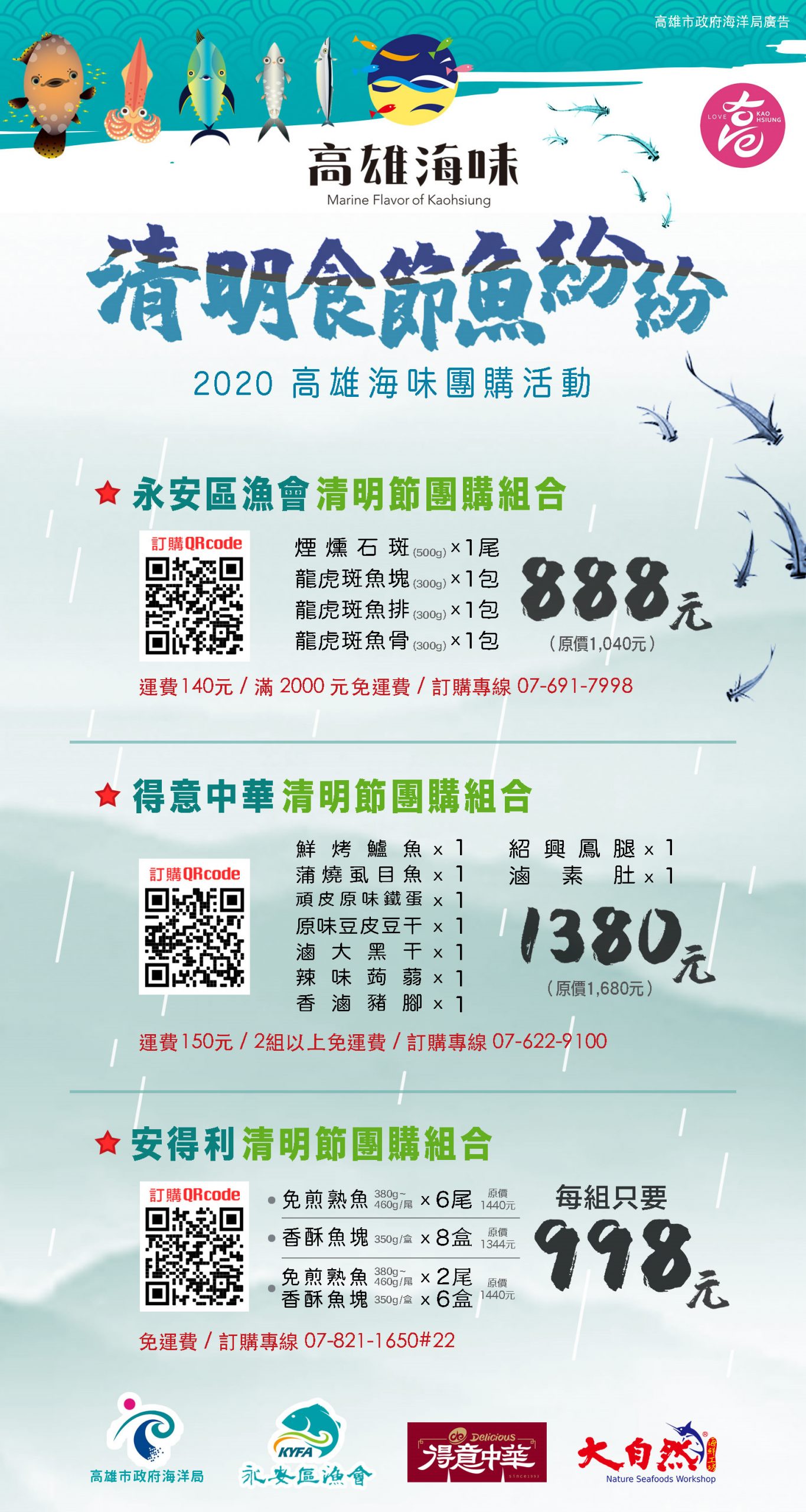 今(3/16)起聯合高雄永安區漁會、得意中華及安得利食品,共同推出的「2020高雄海味熟魚祭祖組合」,嚴選高雄漁產食材,內容包含高雄熟製的石斑魚及鱸魚等超值的水產品,民眾透過祭拜海味組合就可在清明節輕鬆表達誠意。同時防範肺炎疫情,民眾在家就能以優惠價格訂購新鮮又優質的高雄水產品,減少到公眾場所採買的機會,為防疫盡一份心力。