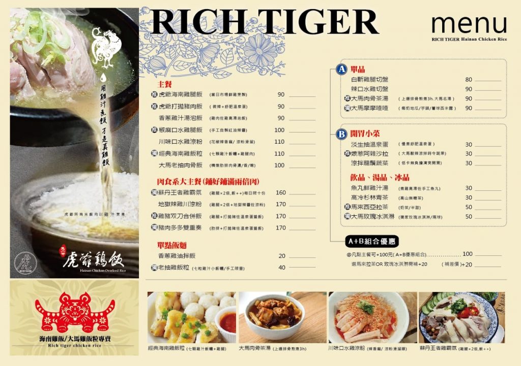 目前虎爺雞飯,共有七家分店,遍佈高雄南北, 採自助點餐的方式,拿份Menu找個喜歡的角落,挑一下最對味的餐點就可以去櫃檯點餐結帳了!另外也有加價升級成套餐的和合(A+B任選一樣搭配+100),就可以飽到天靈蓋。