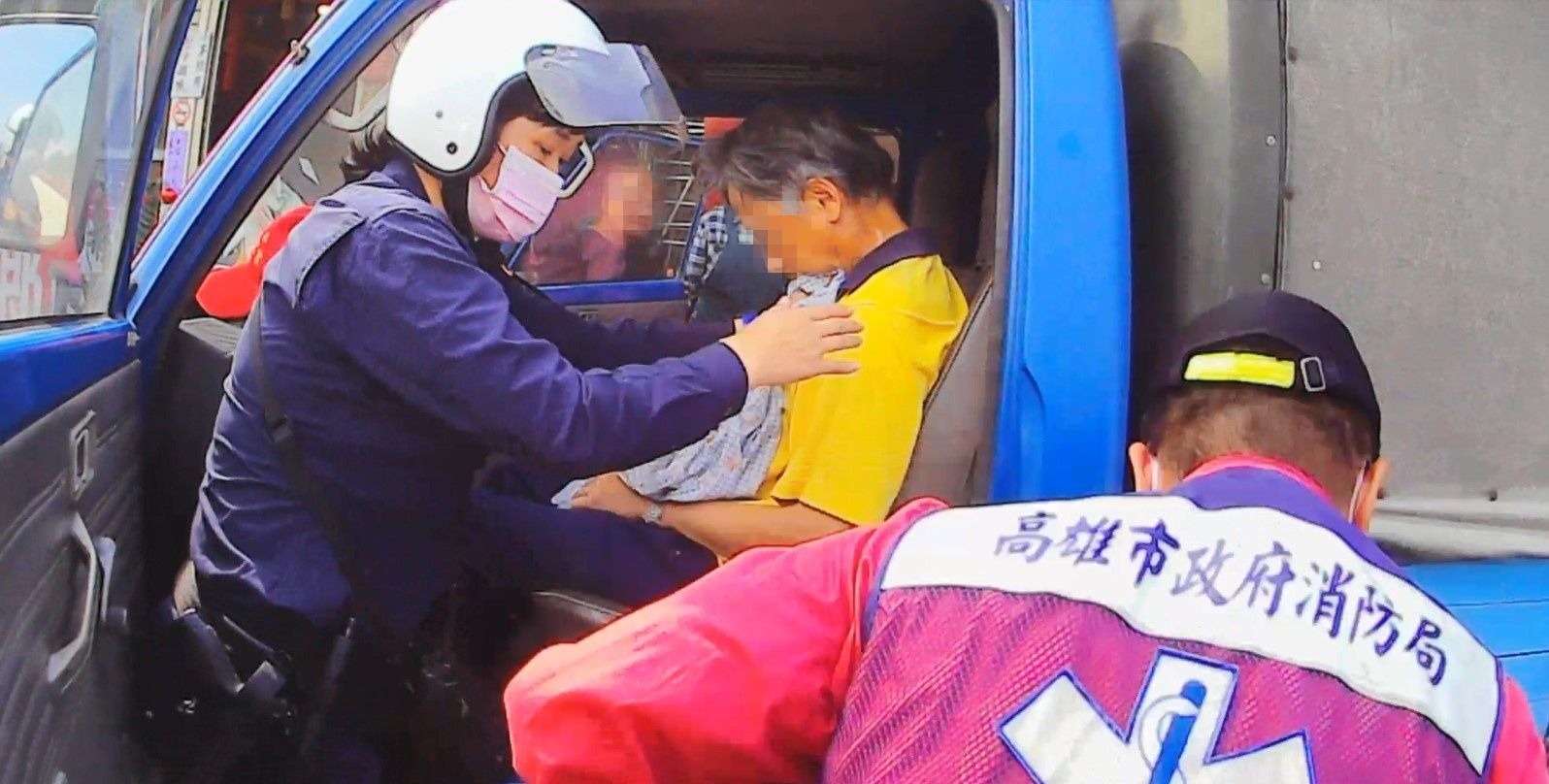 報案民眾說這輛小貨車已經在門口好一陣子而且都沒有熄火,員警上前一看,驚見駕駛座上有一位老先生疑似暈倒,無論大聲呼喊、拍打,駕駛也沒有任何的反應,見狀不對勁火速通知救護人員到場協助送醫並聯繫家屬到醫院處理。