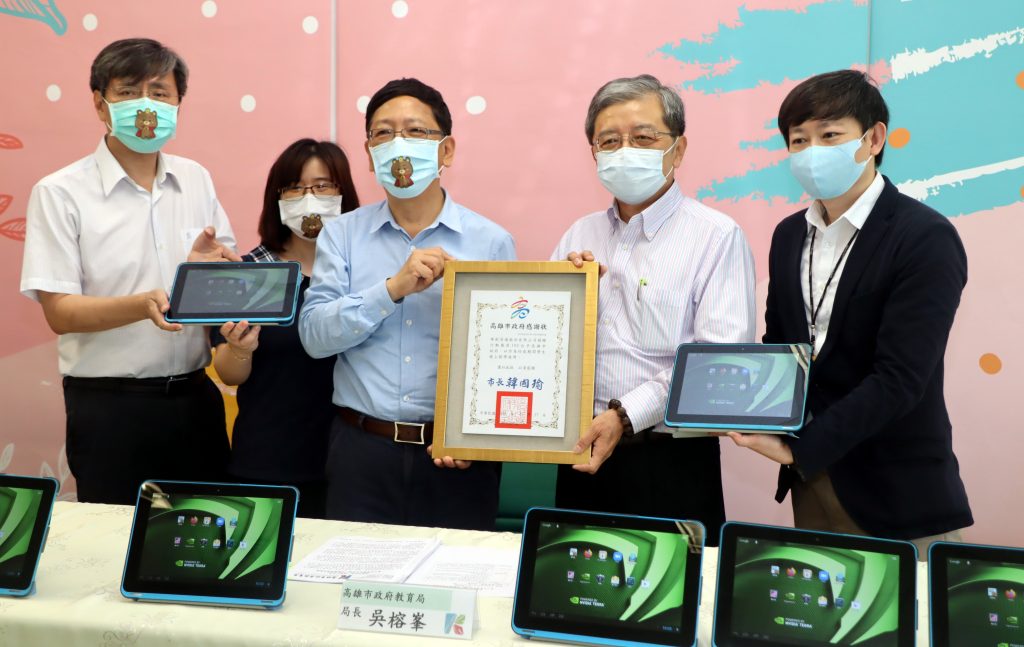 高雄市教育局長吳榕峯今天(4/27)頒發感謝狀,感謝善心業者讓弱勢孩子居家學習不中斷,未來如發生停課,行動載具也將能最快速度送到使用者手上。