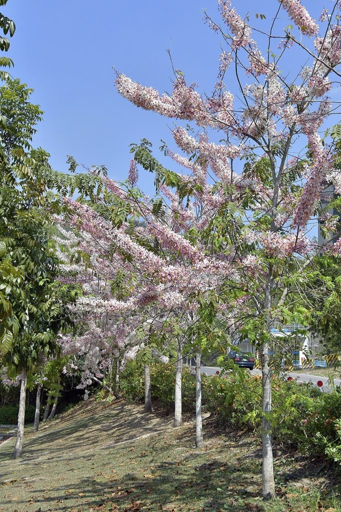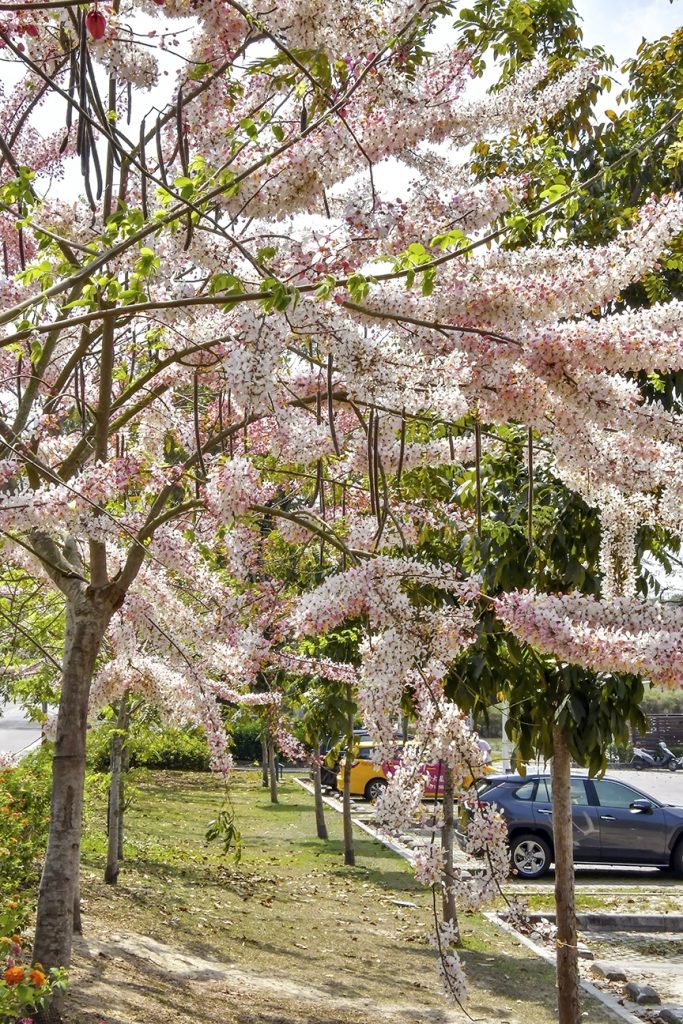 養工處進一步說明,花期約一個月的花旗木(陣雨樹)原產泰國至越南一帶,又名「泰國櫻花」、「平地櫻花」或稱「三月櫻」等,綻放於每年初春3月至4月之間,近幾年逐漸成為民眾避開人潮的賞櫻新玩法。養工處也呼籲,目前阿公店森林公園粉紅櫻雨正盛大,民眾前往賞花時,千萬不可攀折花木,另外賞花時應穿著長衣長褲並且作好防曬準備,避免因蚊蟲或日光曝曬而造成身體不適,正值疫情期間,請民眾務必做好防疫措施,賞花不只開心也更安心。