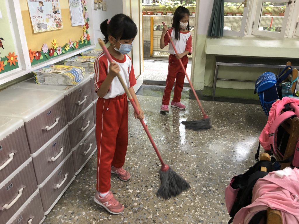 面對防疫,高市嚴正以待,鼓山區中山國小校長蕭木川說,週一上課前也協請專業廠商針對大門與電梯等出入口進行消毒,今天由老師帶領學生一起進行教室課桌椅消毒,同時整理環境,