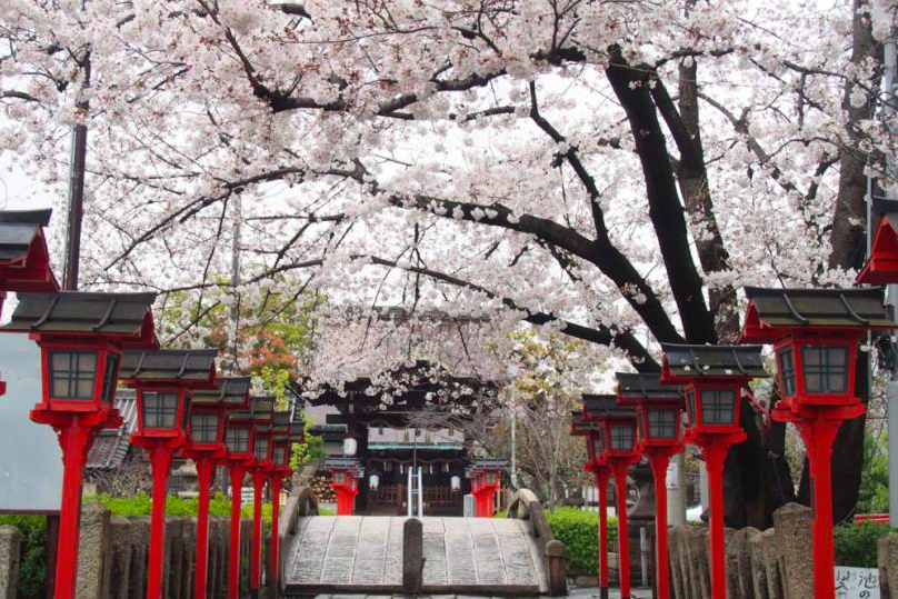 源氏三神社之一,相傳井水是源滿仲出生時洗浴所用,被認為能保佑人們得子、安產,除此之外也是京都在地人熟知的賞櫻祕景之一噢。站在太鼓橋上能欣賞到形色艷放的櫻花,又以淡黃綠色重瓣花朵為特徵的「鬱金櫻」聞名。