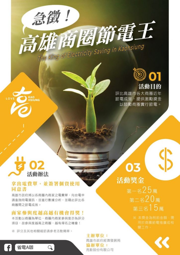 鑑於夏季尖峰用電期將至,規劃「急徵商圈節電王」鼓勵商圈一起實行節電,並藉此選拔節能標竿商圈及案例,將優質做法推廣至其他商圈及服務業落實節電工作。詳情請上 https://khep.kcg.gov.tw/查詢,或至雲端下載簡章https://reurl.cc/QdXmR9。
