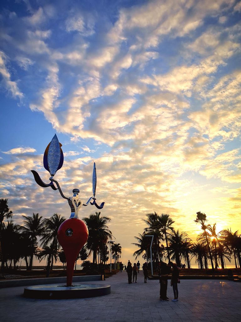 未來旗津可望成為南台灣的觀夕聖地,施工中的「夕照觀景平台」預計6月完工,計畫招商引資「旗津沙灘吧」No.2,打造沙灘夜間觀光活動,另有「沙灘假日文創市集」,最慢10月登場,旗津版的瀨戶內海,由預計12月完成的愛情路藝術廊帶,連接豐收廣場及星光隧道,讓這條三輪車必經之路充滿文藝氣息,打造旗津成為「觀光藝術島」。