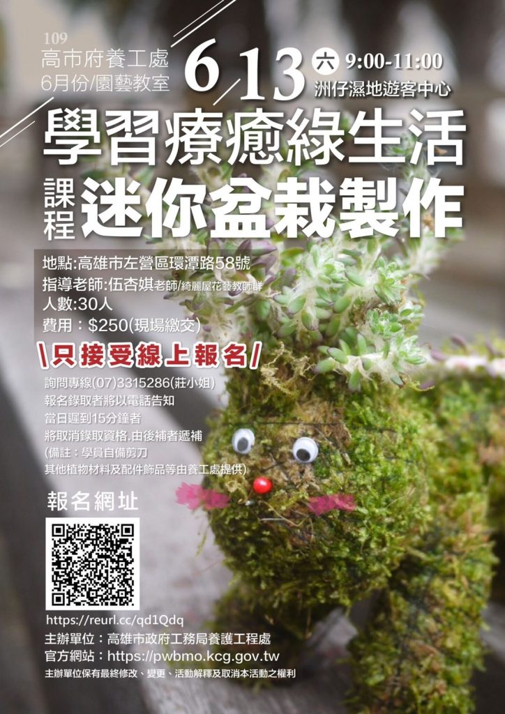 養工處表示,為了讓更多人能體驗DIY盆栽設計與組合的樂趣,特別設計了園藝系列講座,6月份的園藝教室以手作水草為主題,課堂上將有專業的花藝師協助大家一起動手設計出專屬於自己的獨創可愛療癒植物盆栽。