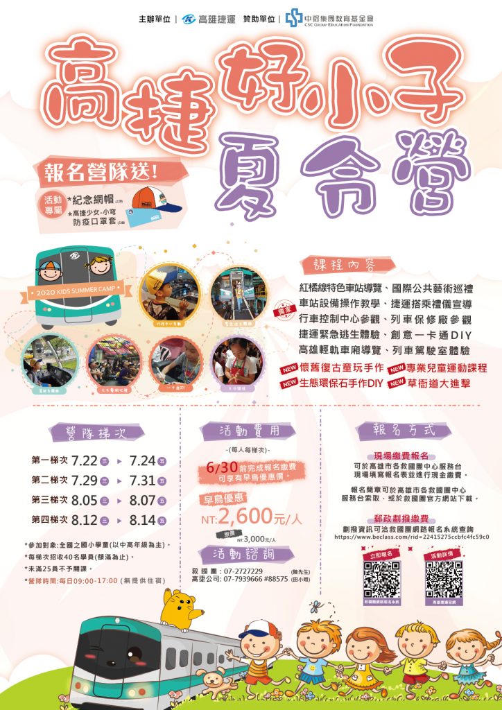 「高捷好小子夏令營」今(1)日開放報名,還加碼送出特色好禮!今(109)年營隊特別與中鋼集團教育基金會合作,加入環保教學課程,還有復古手作及專業體能運動課程,透過跨領域學習的課程,讓孩子們在身心均衡發展下歡樂學習,健康成長。