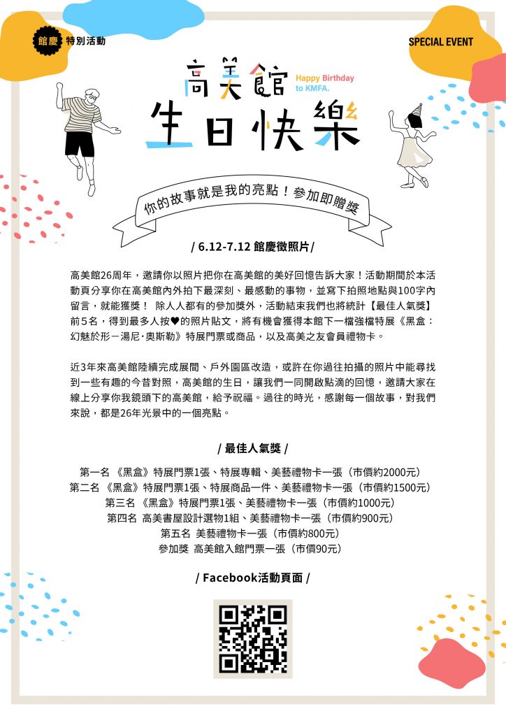 高雄市立美術館26週年線上館慶月,6/12登場,以「館慶月」方式推出一系列別開生面的線上活動,邀請民眾分享與高美館的美好回憶,透過影像回憶,共同補綴完整高美館的26年,也為高美館獻上祝福,凡參加活動即可獲贈入館門票乙張,攜手見證高美館的蛻變與新生。