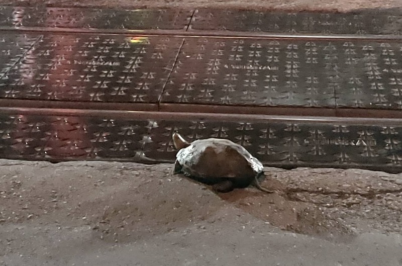 新民路段燈光昏暗,警方定睛仔細一瞧,才發現竟是正在龜速前進的烏龜,經初步觀察這隻長約35公分、寬約20公分的烏龜沒有外傷,只是放任牠繼續龜速爬行,早晚被車子壓碎或造成車禍,基於人道考量以及人龜均安,警方抱起烏龜到附近埤塘放養。