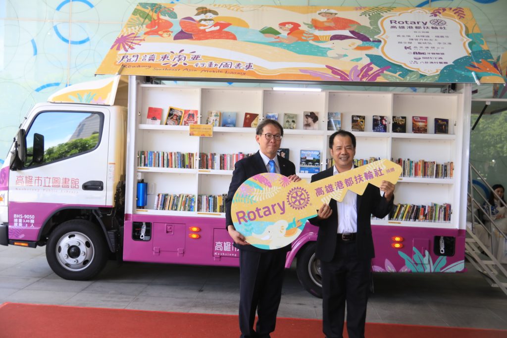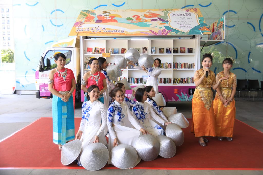 高市圖行動書車換新計畫,在國際扶輪3510地區高雄港都扶輪社號召社友集資捐贈下,今(18)日東南亞書車亮麗登場,車身彩繪以東南亞多國元素打造,滿載5國語言、2000本書籍,讓旅居高雄的東南亞移工朋友借還家鄉文字書籍,以解思鄉情,現場有移民工朋友帶來當地特色甜點與舞蹈增亮點。