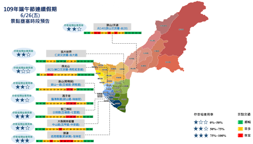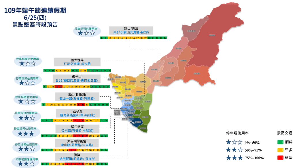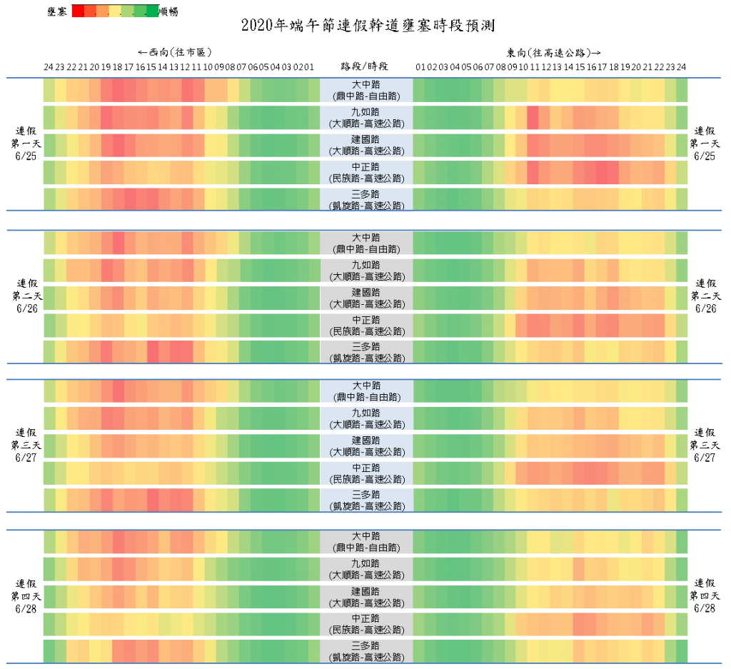 高市交通局預測109年端午節連續假期在午後15至18時車流最多,請市民朋友出門避開壅塞時段。此次連假共計4天(6/25至6/28),6/26及6/27兩日景點周邊流量達高峰,又以旗津、西子灣與駁二地區午後車流最多,流量約較一般假日增加10%至20%,旅行時間約較一般假日增加15%至20%;幹道部分以6/25總流量最高,其中又以中正路東向及大中路西向之車多情形最為明顯,建議民眾提前做好行程規劃。
