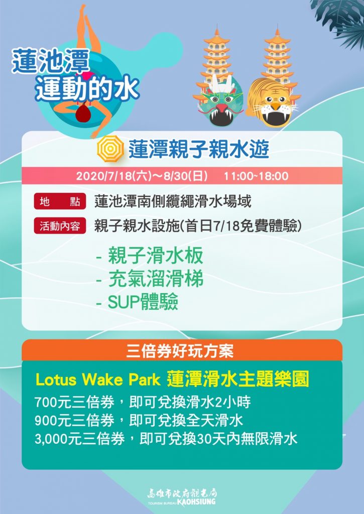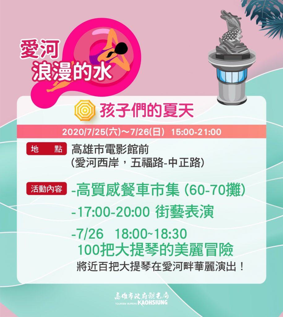 今年暑假因疫情影響來得遲,高市觀光局順勢在7/18至9/30推出以水為主題的「高雄真水 2020夏季系列活動」,3大主軸運動的水-蓮池潭、青春的水-旗津、浪漫的水-愛河,展開為期三個月的高雄真水,就是要你來高雄清涼消暑!