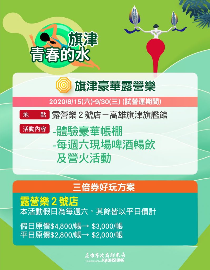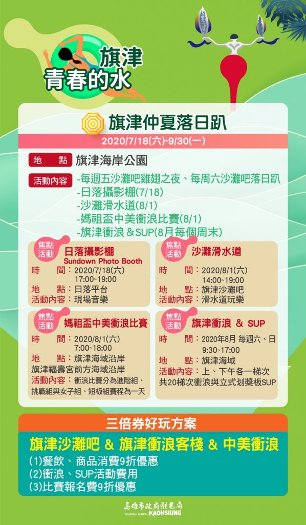 此外,8月進入高雄最酷熱的暑季,8/1起在旗津沙灘吧前登場的是沙灘滑水道,同時舉辦媽祖盃中美衝浪比賽,8月每週六日在旗津都有衝浪及立式划槳教學,8/15至9/30在旗津露營區由旗津豪華露營樂活動接棒,體驗豪華帳棚,更有每週六啤酒無暢飲與營火活動。