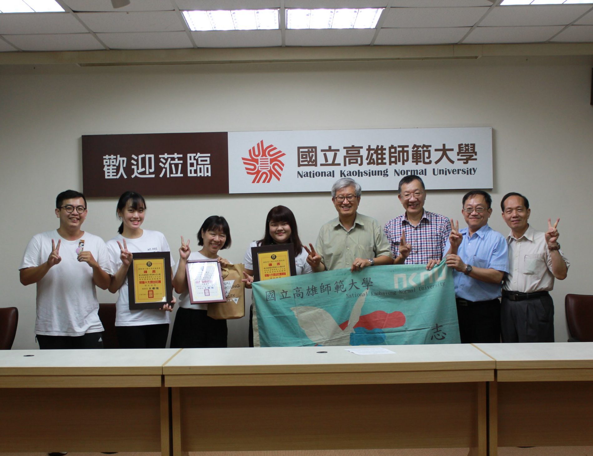 日前國立高雄師範大學志工團榮獲第二十七屆傑出青年獎-「十大傑出社團」、「十大傑出社團領袖」以及「十大傑出社團指導老師」,校長吳連賞今(15)日親自頒贈禮品道賀與嘉勉獲獎對象。