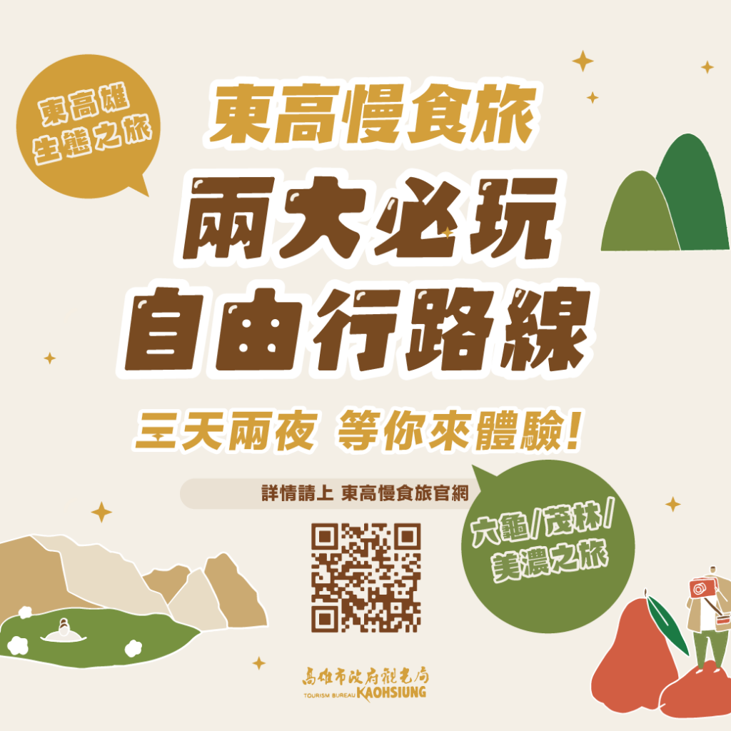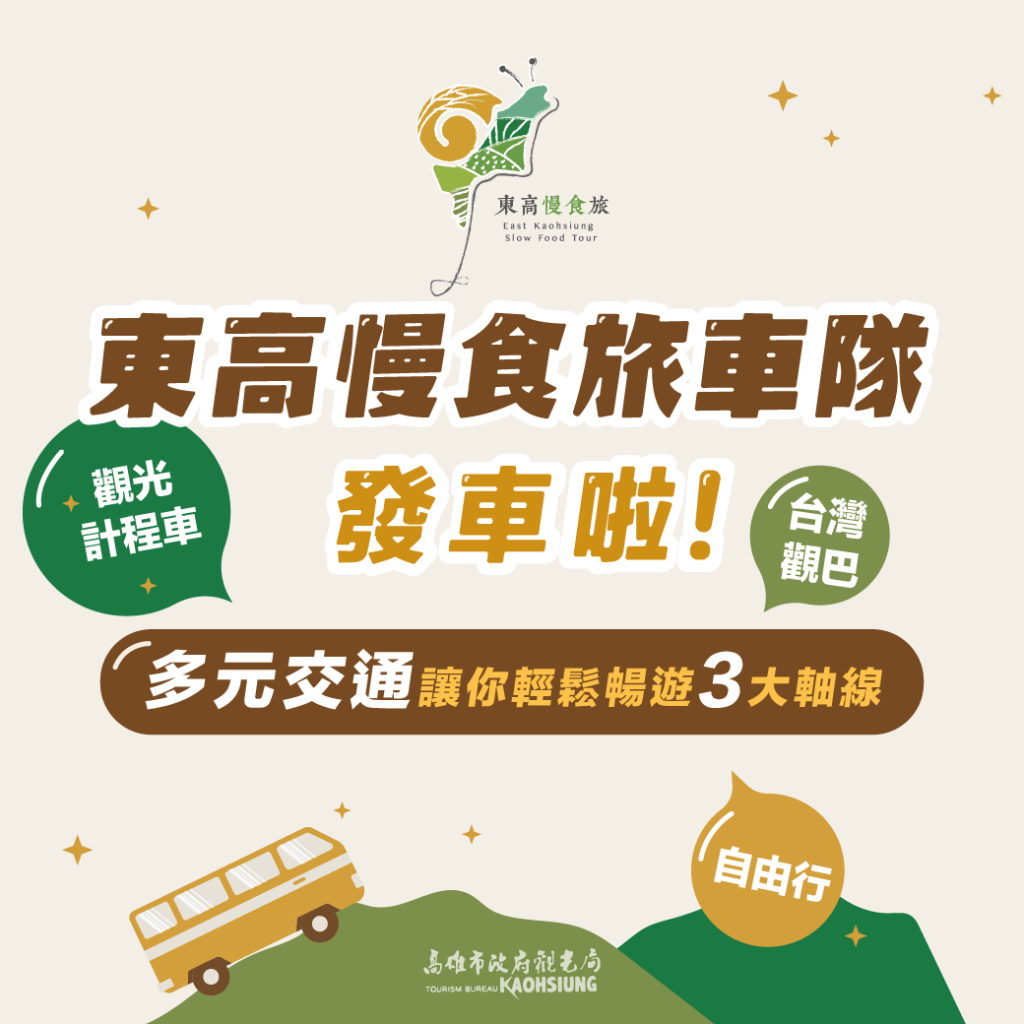 東高雄具備好山好水,幅員廣大,可說是連高雄人都不一定了解的旅遊秘境,因交通偏遠,缺乏資源整合,觀光局為解決偏鄉問題,今(109)年4月放開原鄉特色民宿申請,進一步解決偏鄉交通問題,透過東高慢食旅車隊啟動(台灣觀巴-金建旅行社、觀光計程車隊-和運、大都會),以半日、全日遊包車型態提供民眾預約選擇,前往車隊提供的推薦景點,也提供客製化行程,多元的玩法讓人驚艷不已,目前持續訓練在地導覽及慢食店家輔導,10月「東高慢食旅月」主題月將發布更多好玩好吃資訊,詳情請洽高雄旅遊網查詢。
