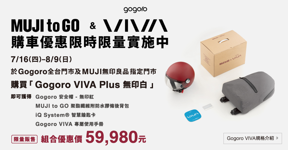 綠色交通已是全球趨勢,交通智慧化更是便利生活的要件之一,日前文青系品牌無印良品看準電動車商機,與Gogoro推出聯名款,VIVA Plus的純白色在文青界引起一陣騷潮,即日起至8/9到 Gogoro 全門市與全台7間 MUJI無印良品指定門市選購還有限量交車禮可拿。