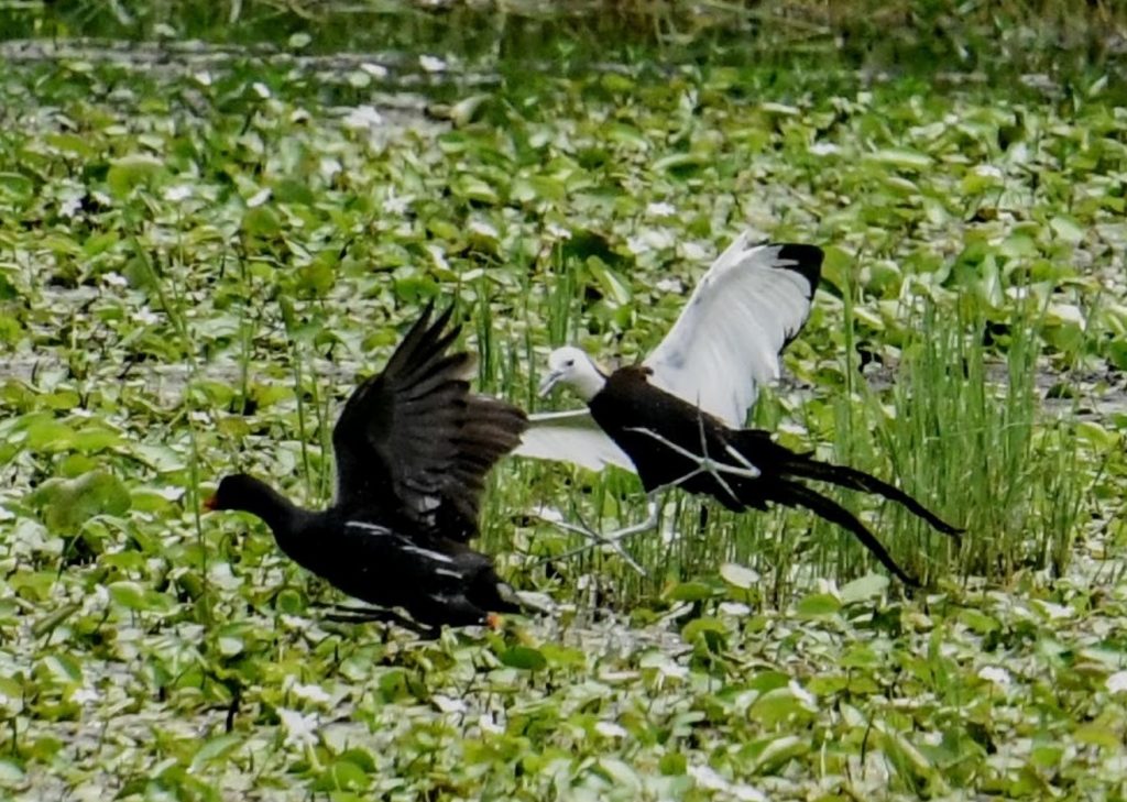 水雉爸爸在繁殖其更會為了寶寶展現動物領域行為的硬漢之姿,佔領一片區域以抵抗同種其他個體或其它物種的入侵,守護爭來的領地確保後代有豐沛的食物來源。此外當外侮侵門踏戶時,更會強勢振翅或以腳爪激烈攻擊來護巢驅趕。